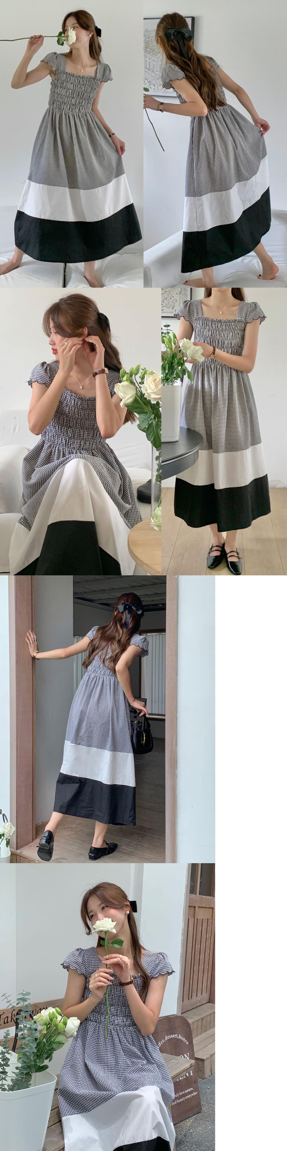 [EWQ] スクエアネックコントラストチェック柄ドレスフライングスリーブ弾性ウエストパッチワークドレス夏潮 Vestido エラスティック 伸縮 サマー 夏物 スクウェア