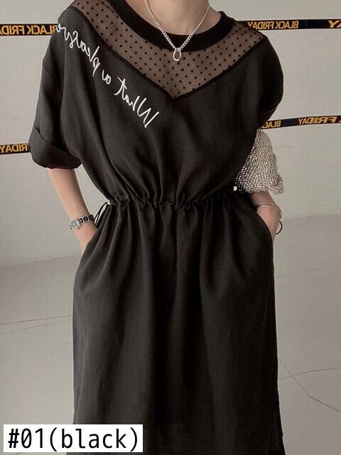 [EWQ] スプライスメッシュ巾着ドレスコントラストカラーレター半袖スプリットドレス夏潮 Vestido 16Y8818 ショート ハーフスリーブ サマー 夏物