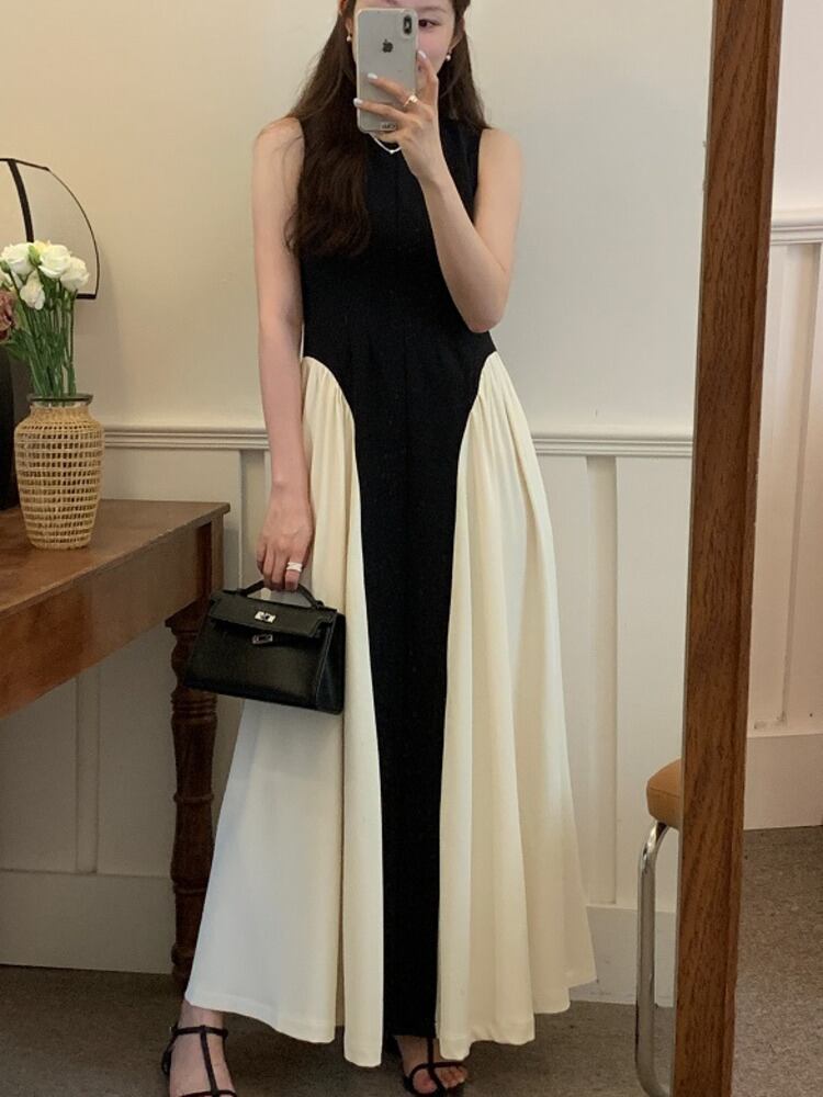 [EWQ] スリムフィットコントラストベストドレスプリーツウエスト白黒ノースリーブドレス夏潮 Vestidos ホワイト ブラック サマー 夏物