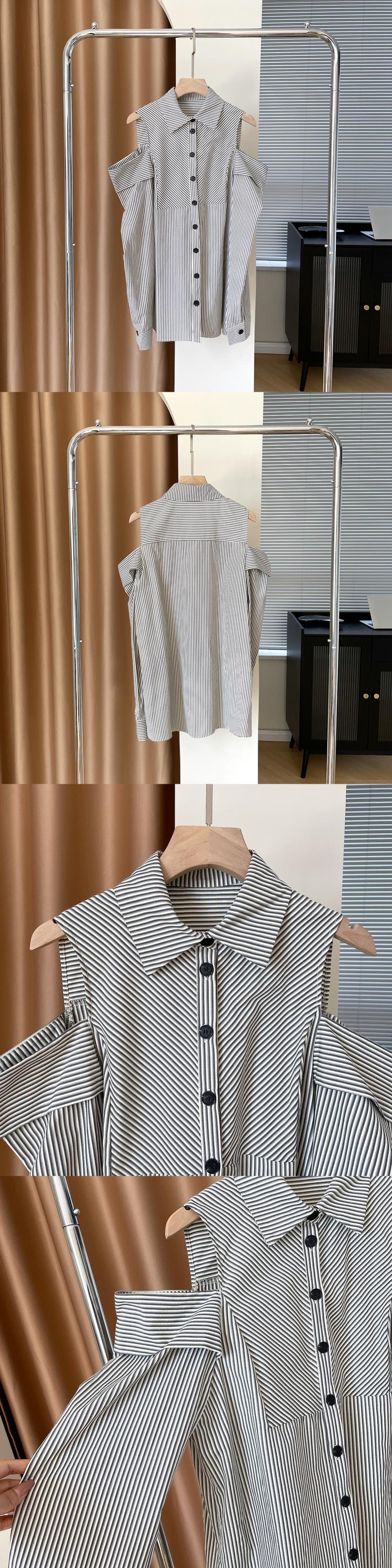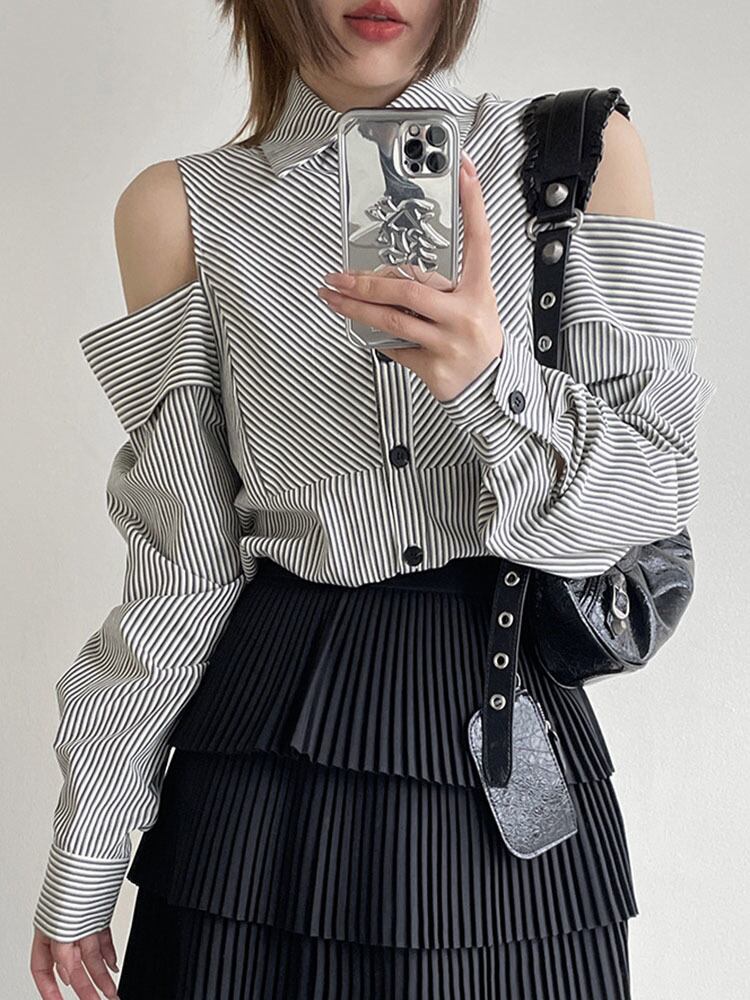 [EWQ] 美しいトップストライプシャツ不規則中空アウトラペルシングルブレストトップス夏フルスリーブブラウス サマー 夏物
