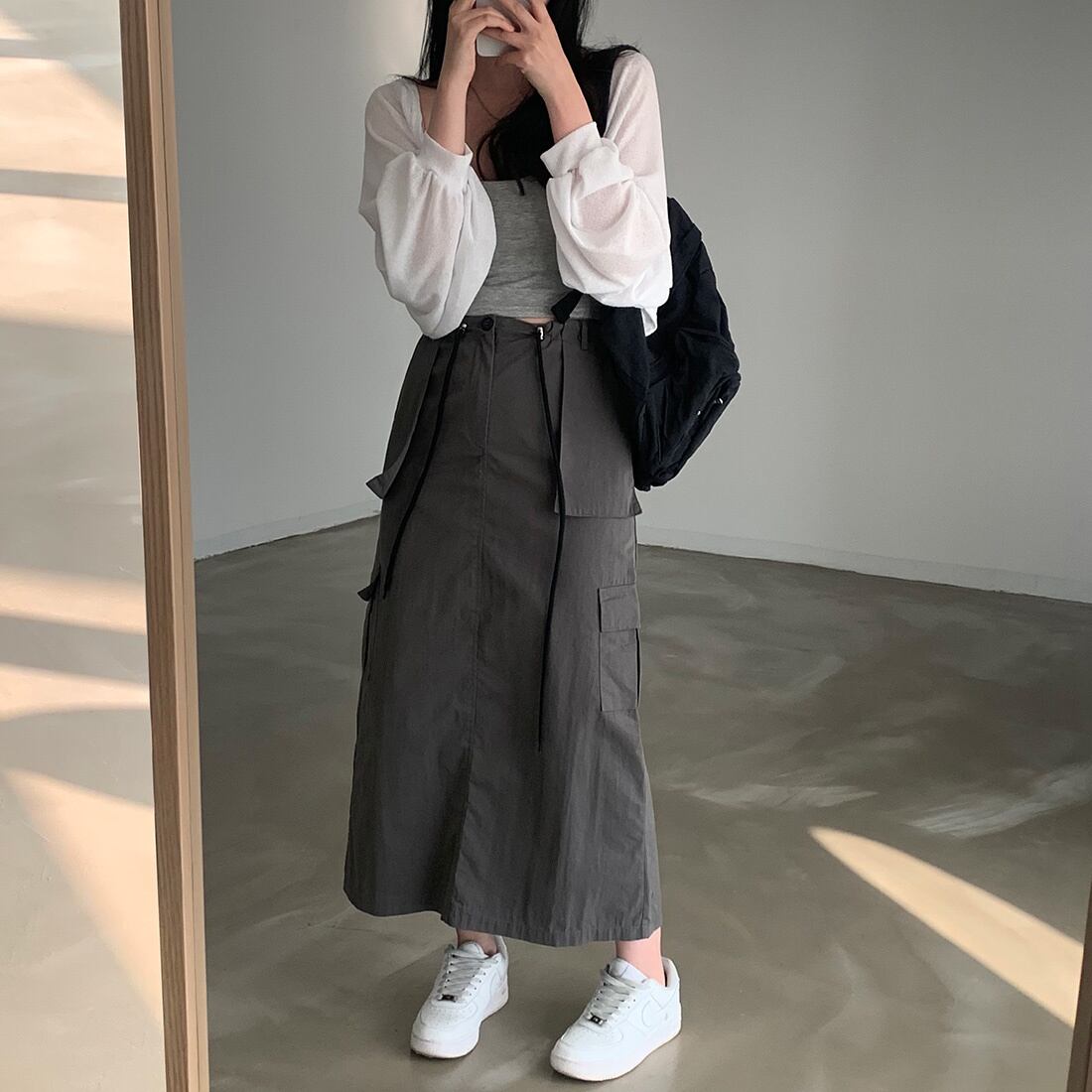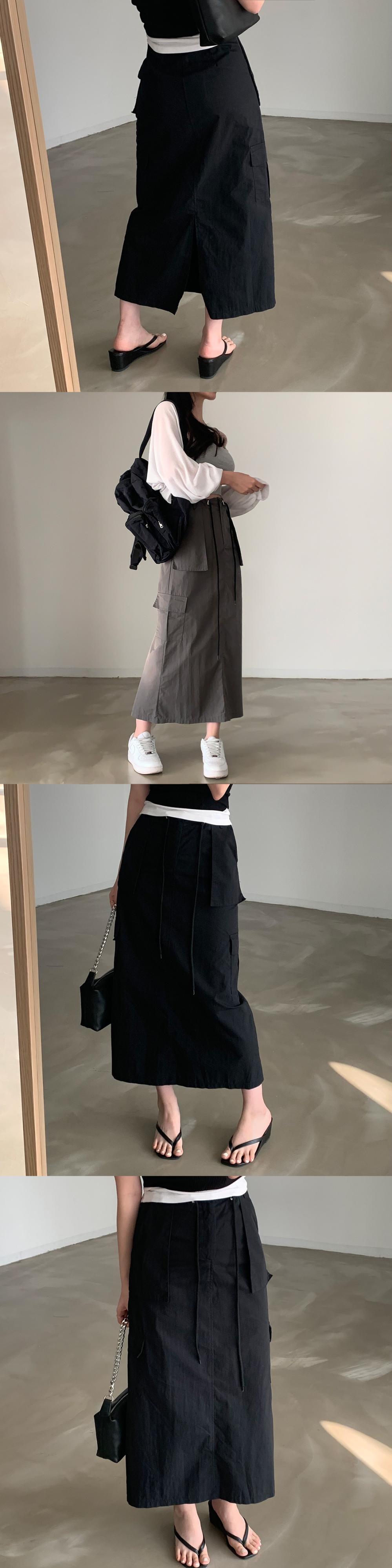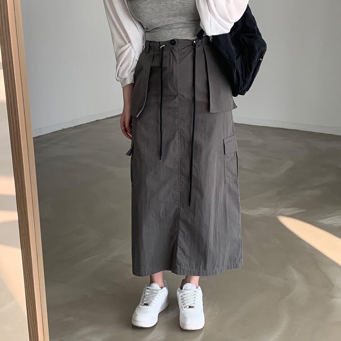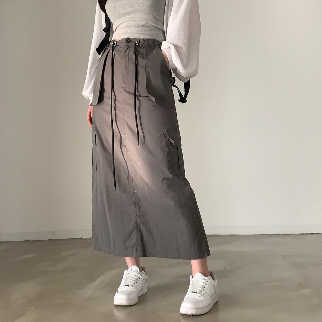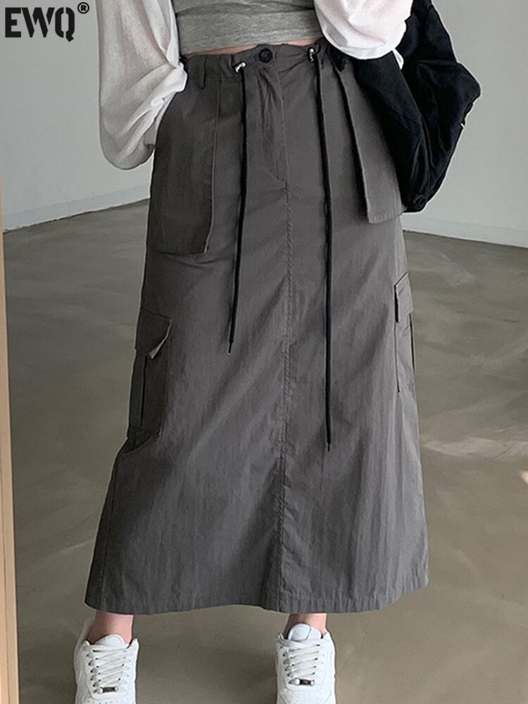 [EWQ] グレーレースアップスカートウエストポケットスプライスソリッドカラーミッドカーフスカート夏オールマッチ服 サマー 夏物
