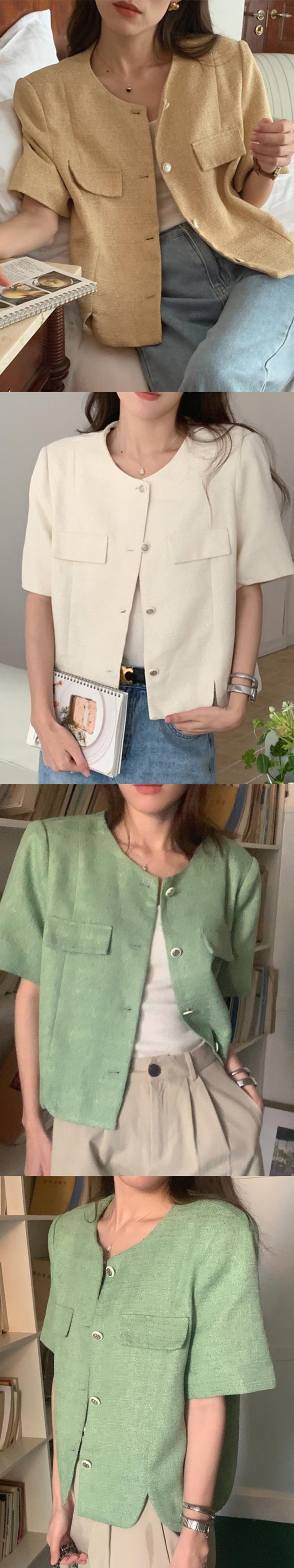 [EWQ] シックシングルブレストツイードジャケット O ネックルーズ半袖ウールジャケットコート夏潮生き抜く Y9124 ショート ハーフスリーブ サマー 夏物 Oネック