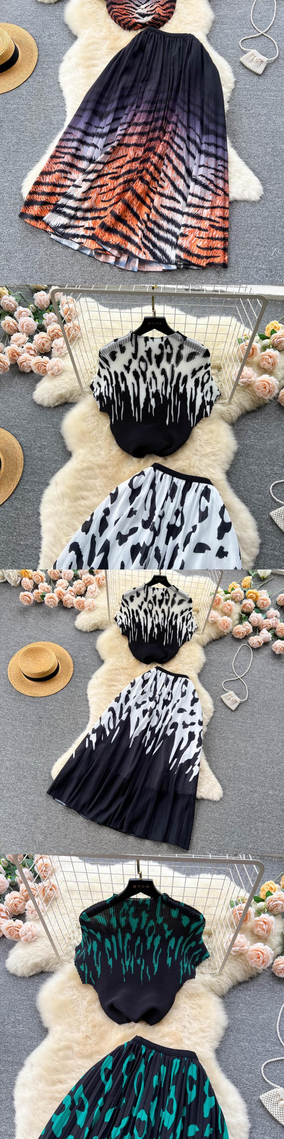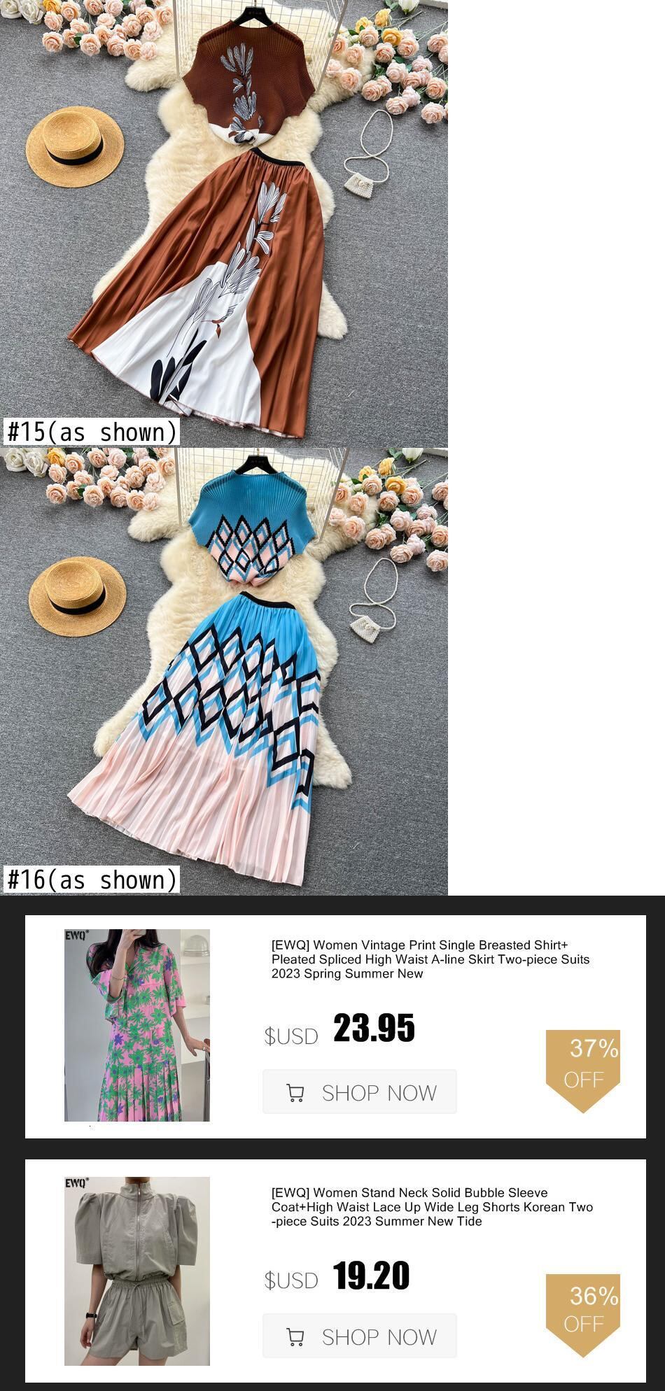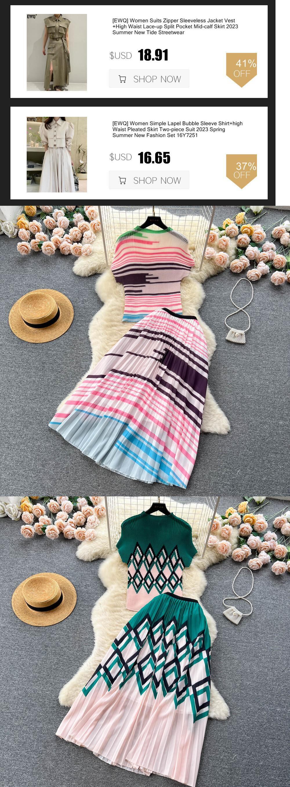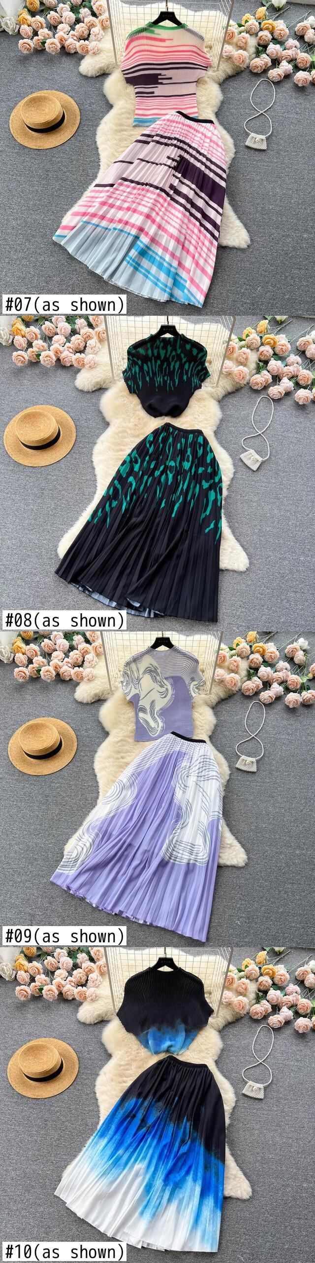 [EWQ] 高級セット レディース サマー プリント プリーツ トップ + ウエストひだ コントラスト A ライン スカート タイド ツーピース スーツ 夏物 Aライン