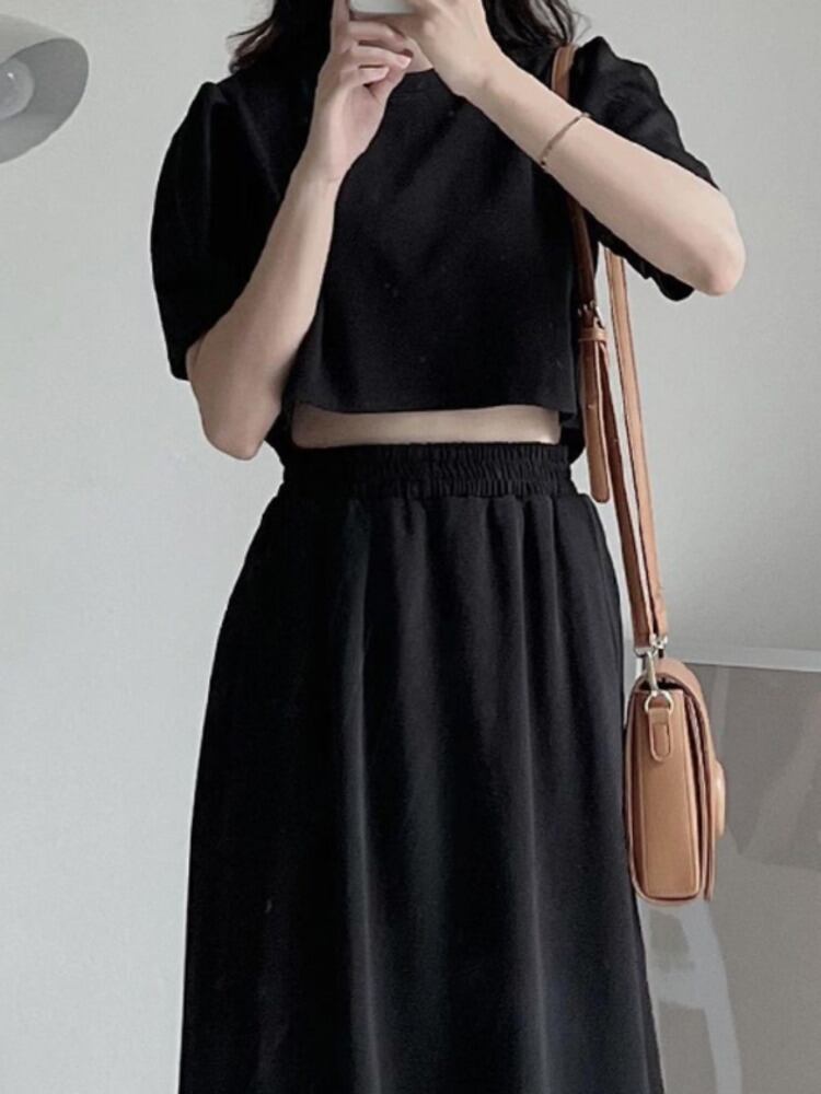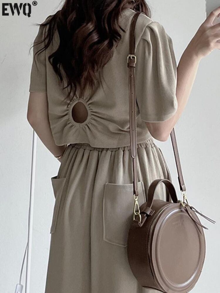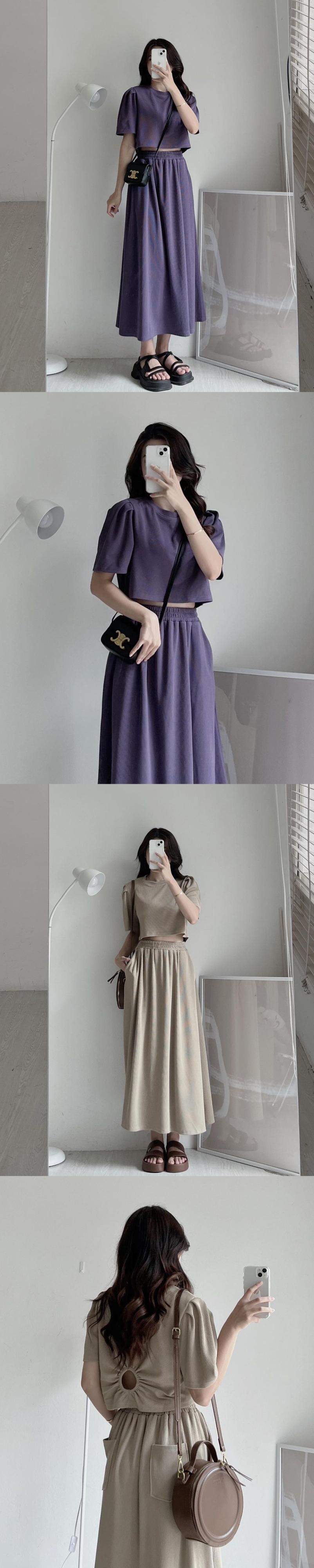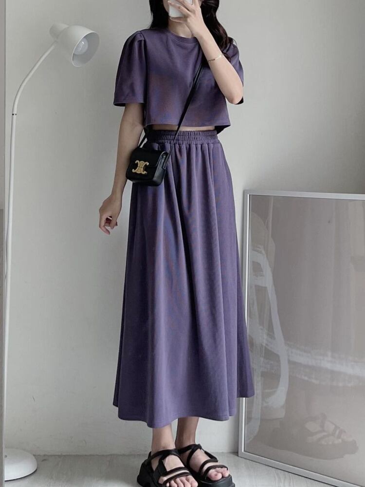 [EWQ] O ネックくり抜きバックレス T シャツ + ハイウエストミッドふくらはぎスカート夏潮紫ツーピーススーツ ハイウェスト サマー 夏物 Oネック Tシャツ パープル