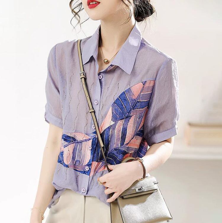 [EWQ] レディース コントラスト パース シャツ サマー タイド プリント 半袖 シングルブレスト トップス 16Y9185 ショート ハーフスリーブ 夏物