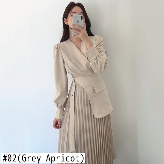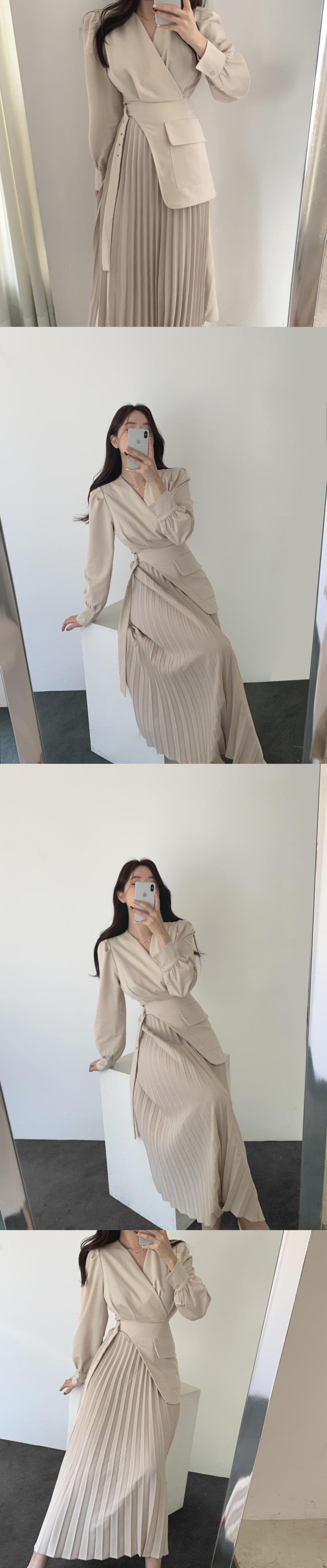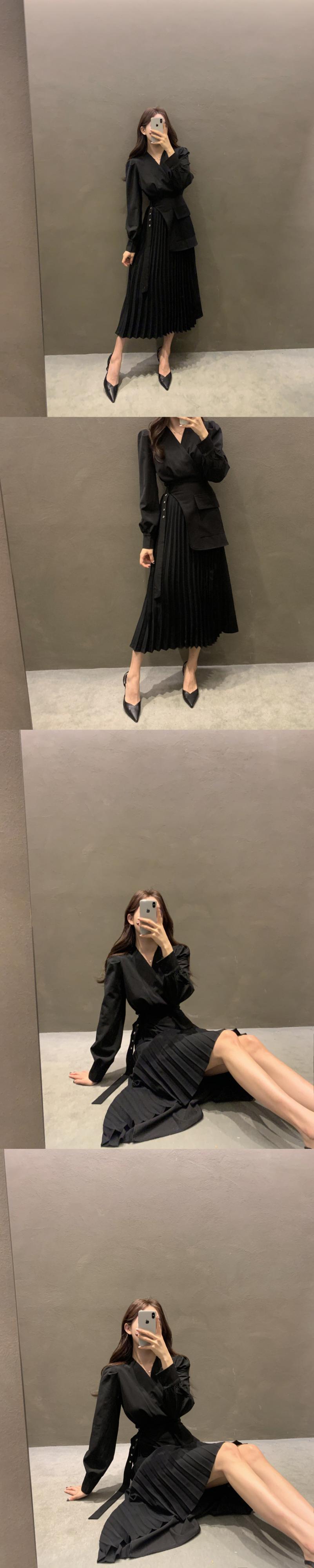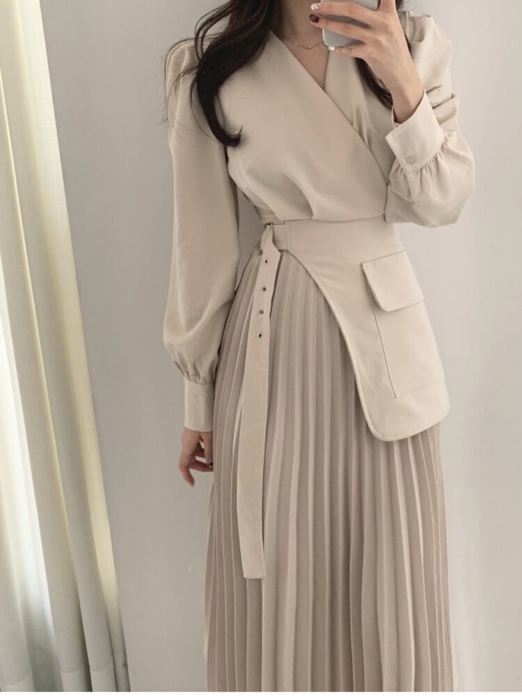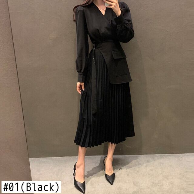 [EWQ] シック V ネック長袖モダンレディドレス美しいパッチワークプリーツ裾 A ラインスーツドレスベルト Q82 ロング ハーネス Vネック Aライン