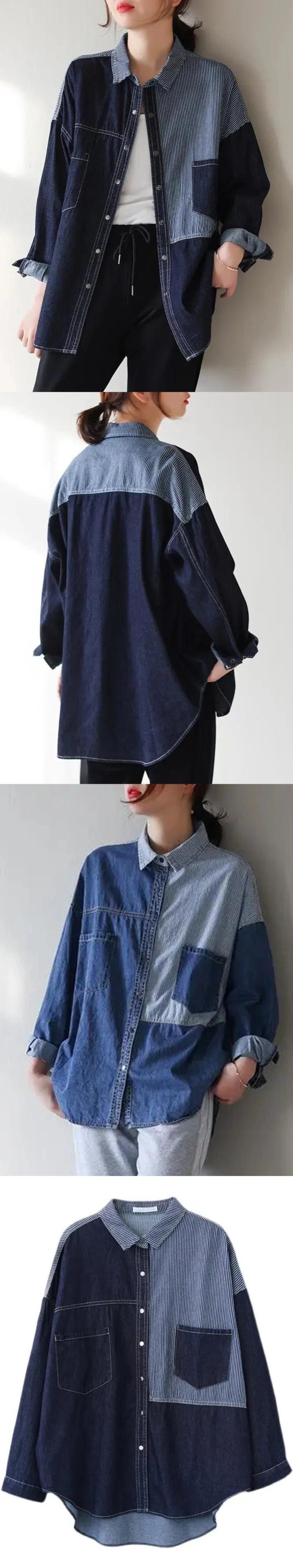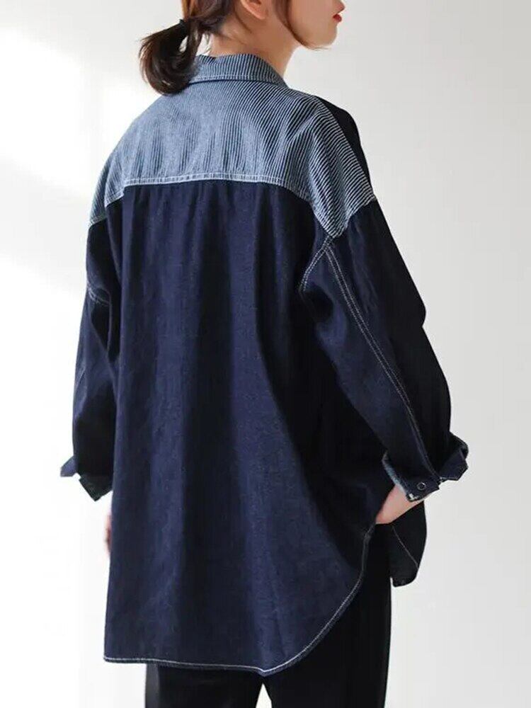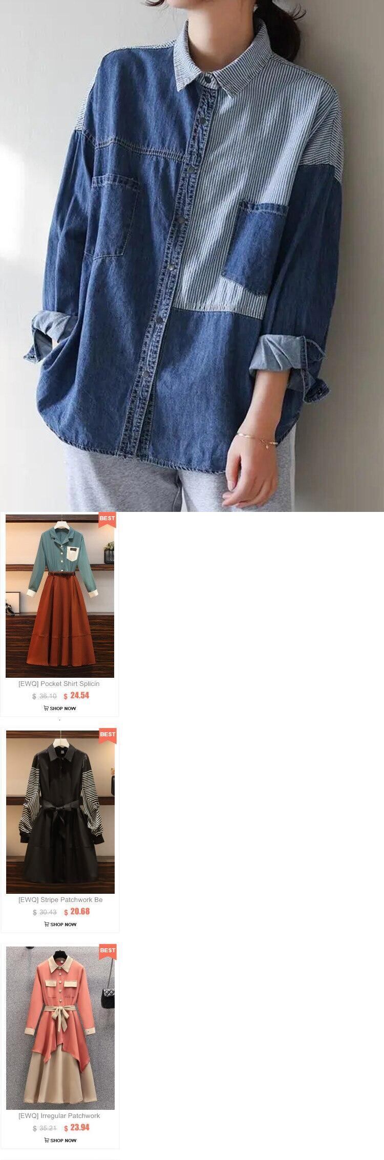 [EWQ] パッチワークデニムシャツコントラストシングルブレストビッグサイズポケットブラウス夏潮長袖トップ ロング サマー 夏物