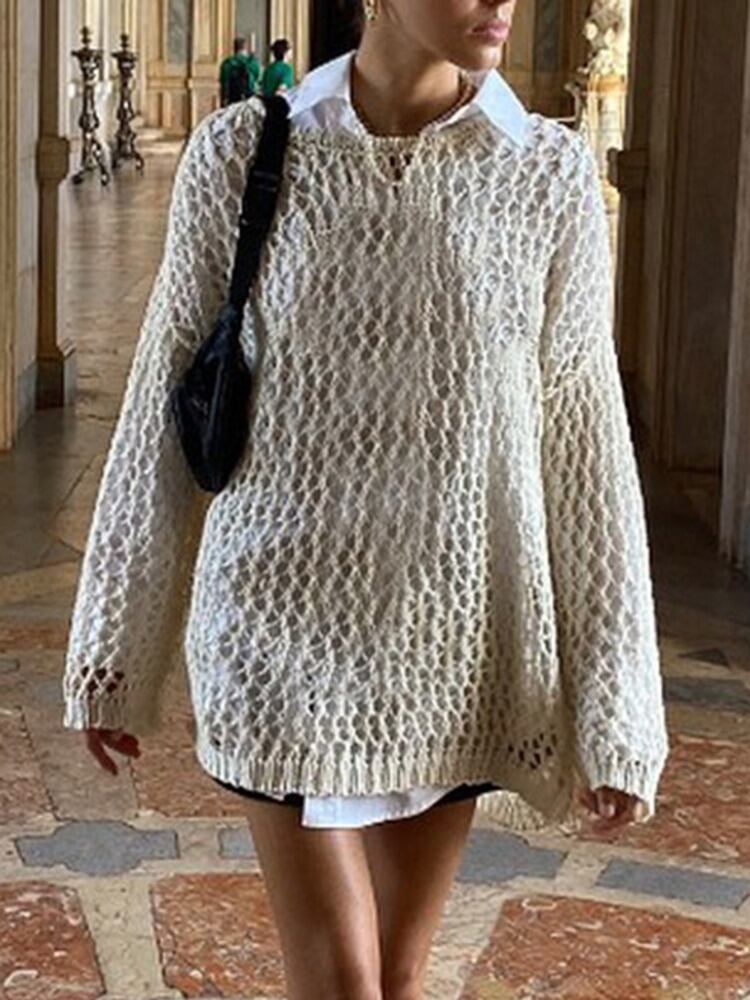 [EWQ] 中空アウトプルオーバーニットウェア長袖薄手ニットルーズストリート O ネックセーター夏潮トップ ロング サマー 夏物 Oネック
