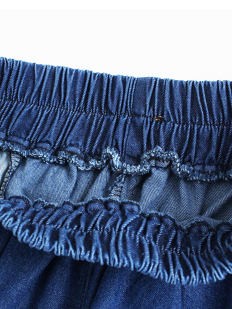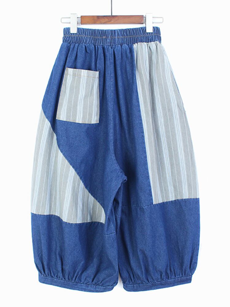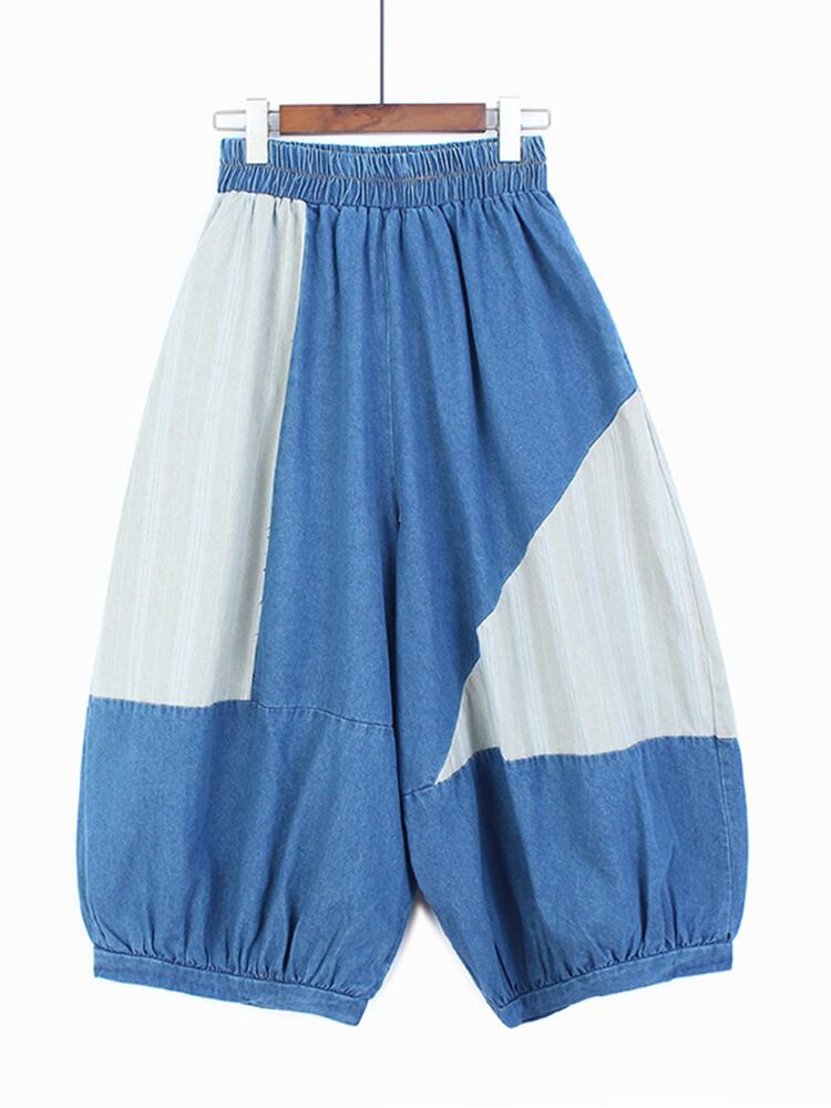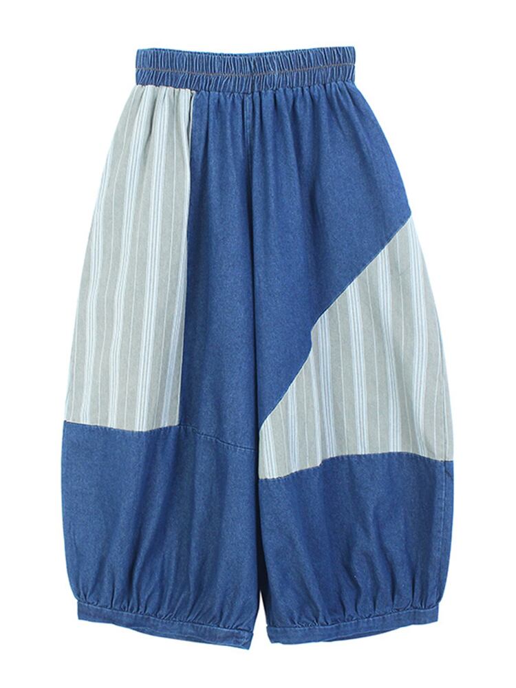[EWQ] ストライプパッチワークデニムパンツビッグサイズ夏潮ストリートコントラスト弾性ウエストジーンズ 16Y9530 エラスティック 伸縮 サマー 夏物