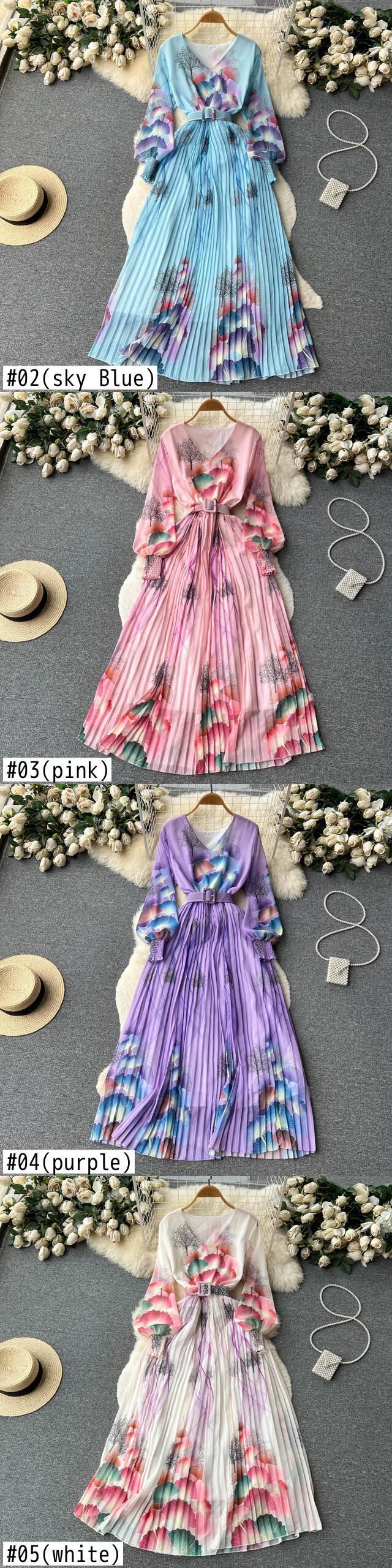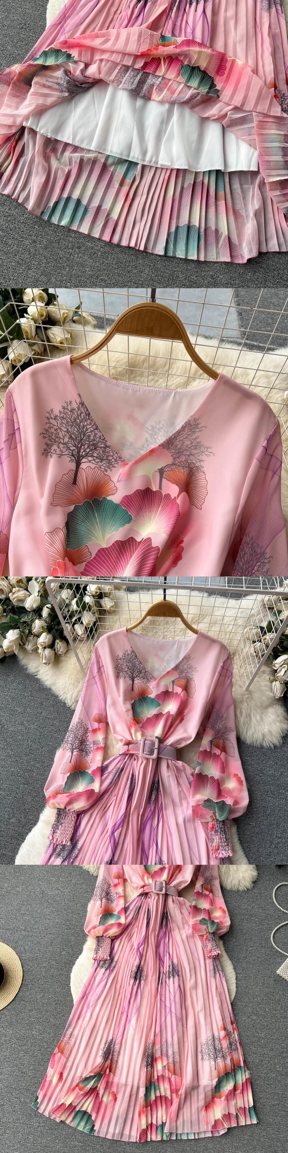 [EWQ] プリントプリーツレースアップドレスランタンスリーブフラワーコントラストカラーパーティードレス夏潮 Vestidos サマー 夏物 フラワーデザイン