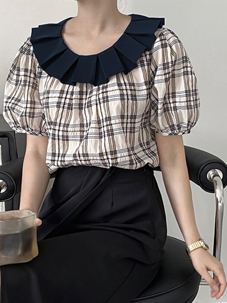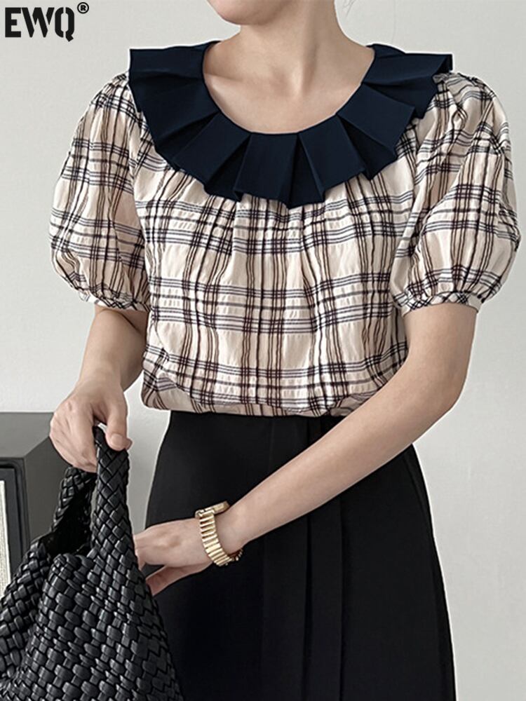 [EWQ] コントラストピーターパンカラーシャツチェック柄パフスリーブカジュアルブラウスサマータイド 16Y9647 夏物