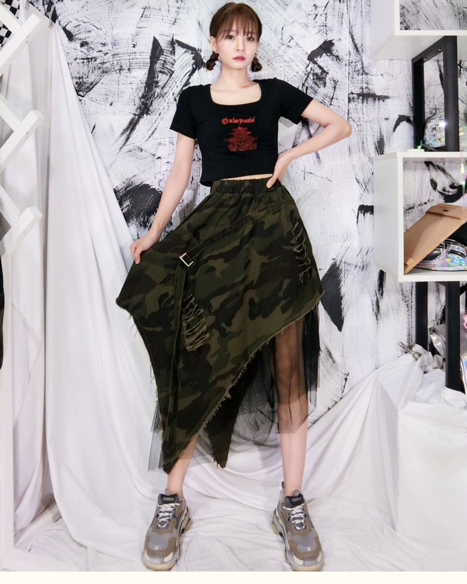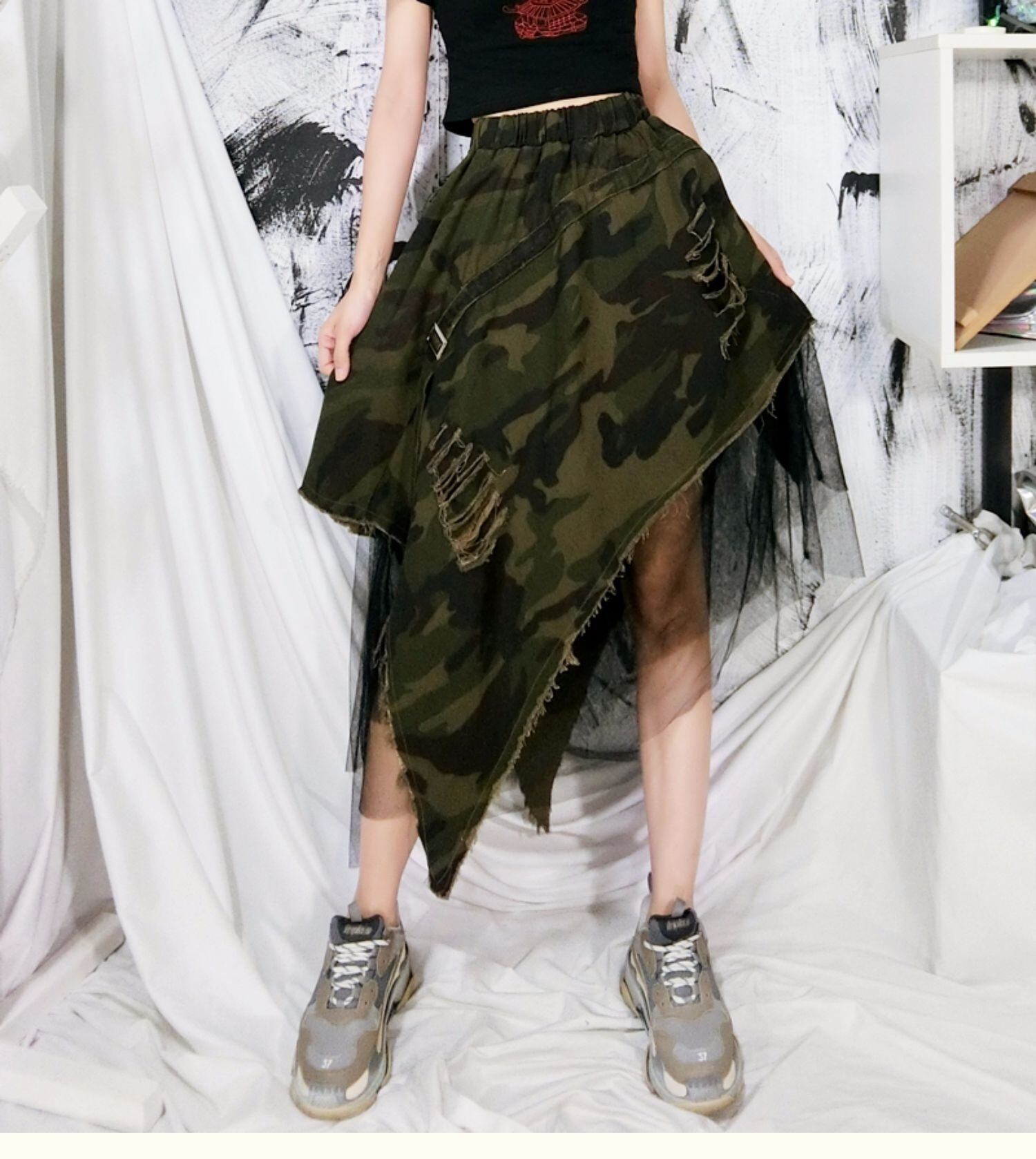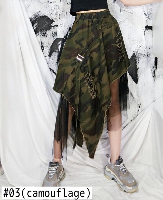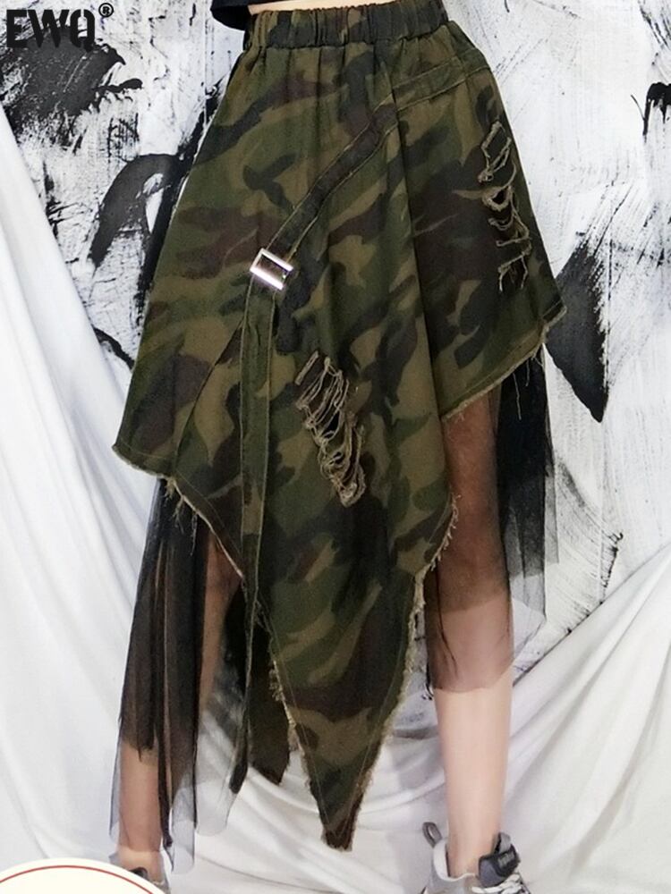 [EWQ] デニムスカート迷彩スプライシングガーゼ不規則 A ラインスカート夏潮ウエストホールファルダス Y9351 サマー 夏物 Aライン