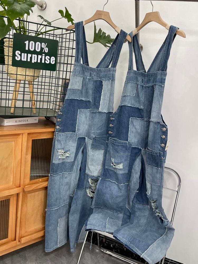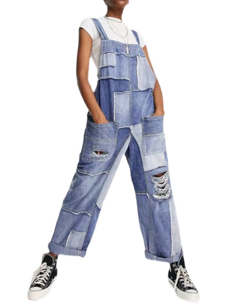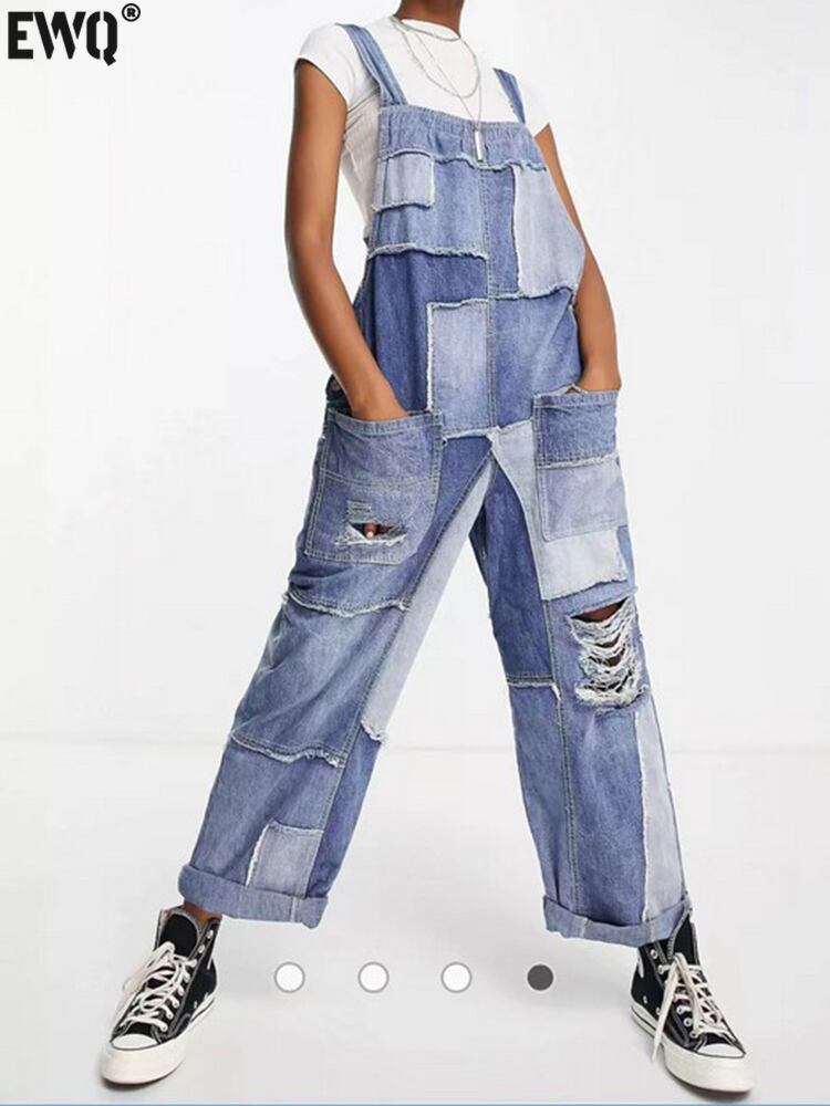 [EWQ] 夏プリントサスペンダーデニムパンツルーズカジュアルパンツパッチワークコントラストストラップジーンズストリート サマー 夏物