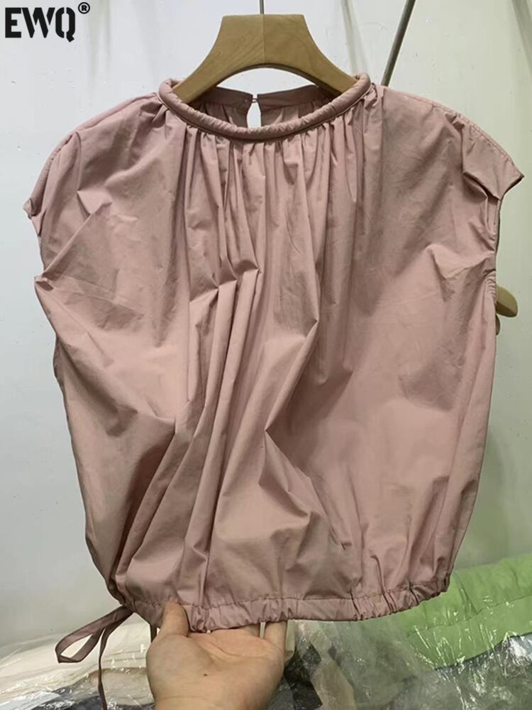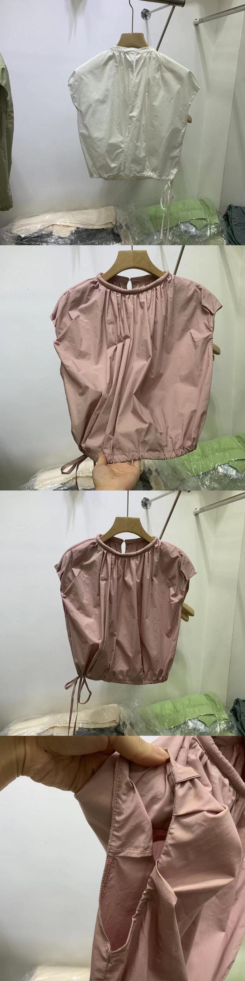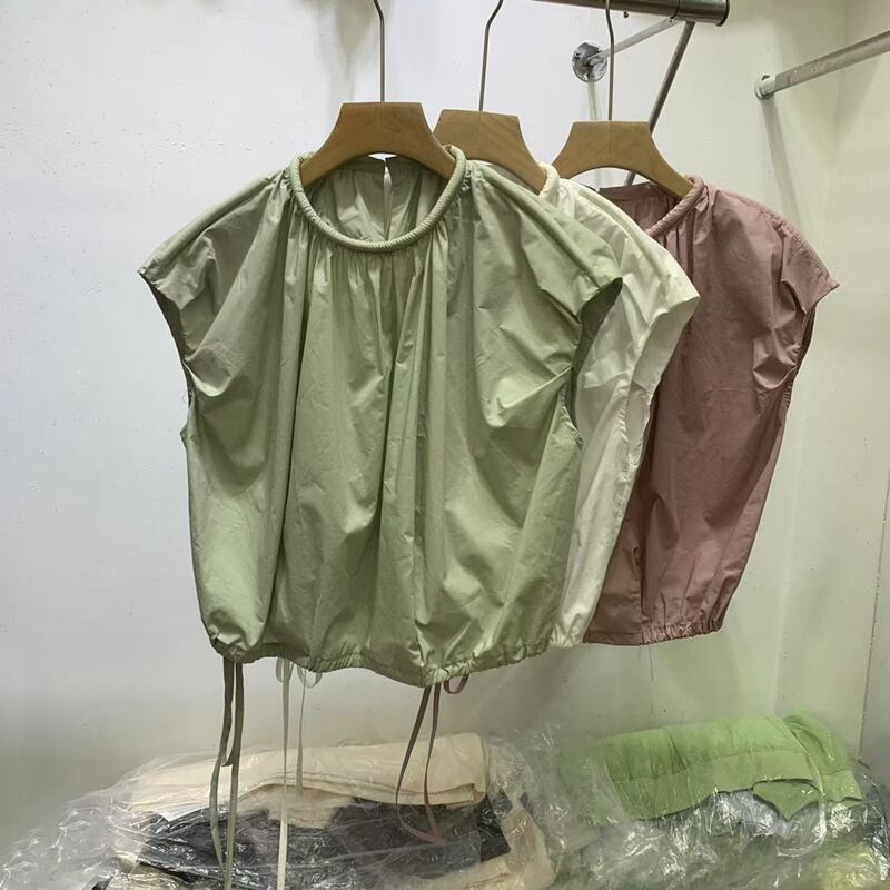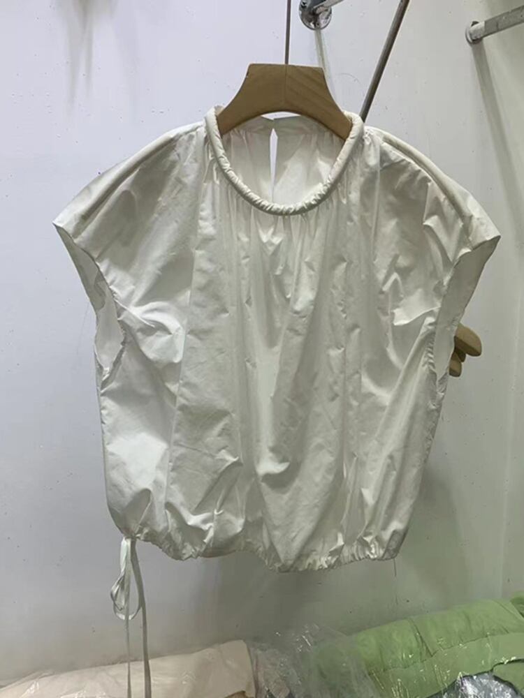 [EWQ] O ネック ノースリーブ シャツ レディース 夏 巾着 無地 ゆったり カジュアル トップス トップス サマー 夏物 Oネック ソリッドカラー