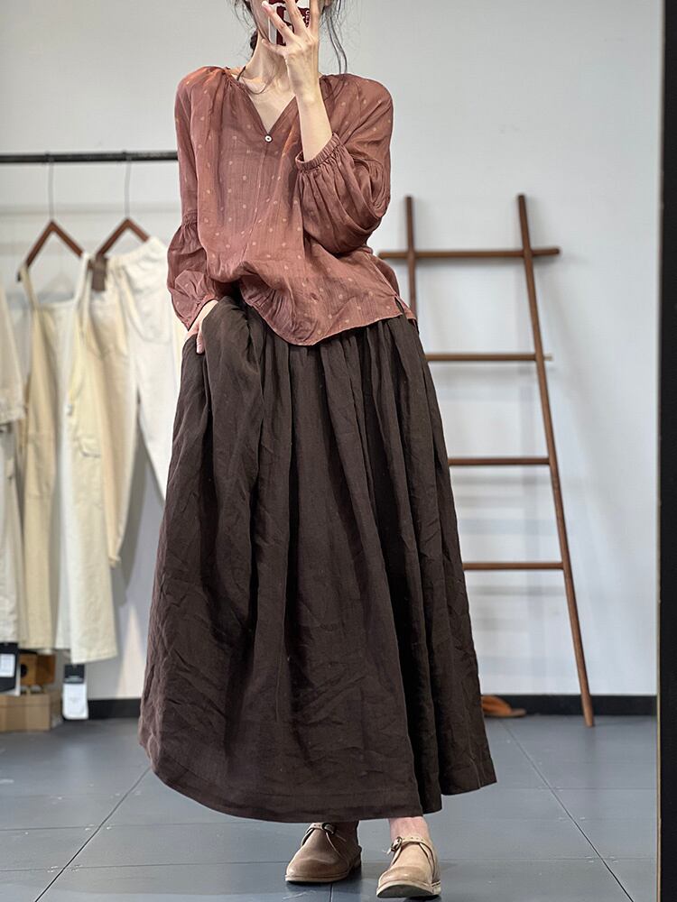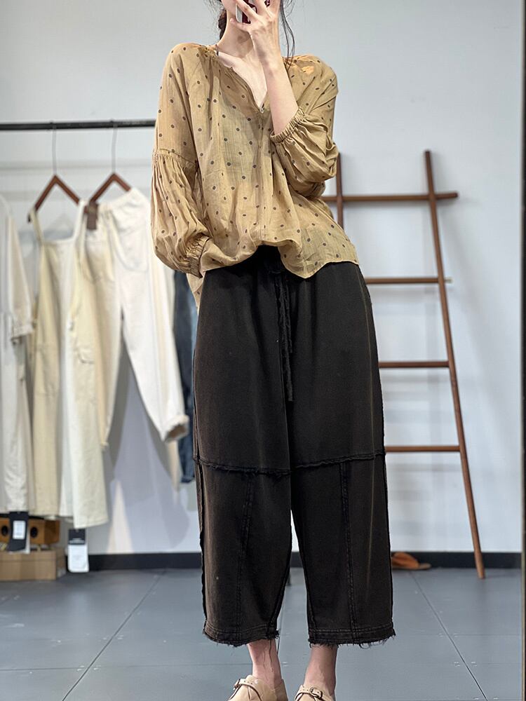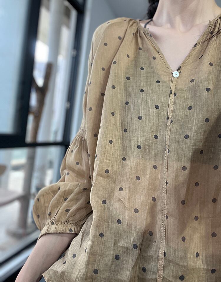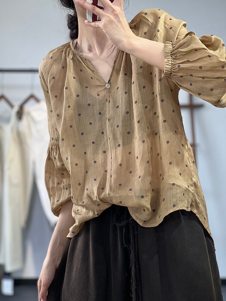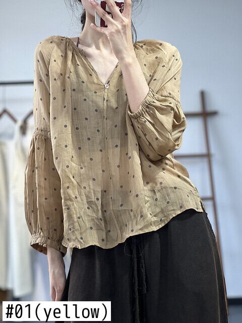 [EWQ] レディース プリント ルーズ カジュアル シャツ 長袖 遠近 Vネック ドット 夏潮 ビッグサイズ ブラウス 9462 ロング サマー 夏物