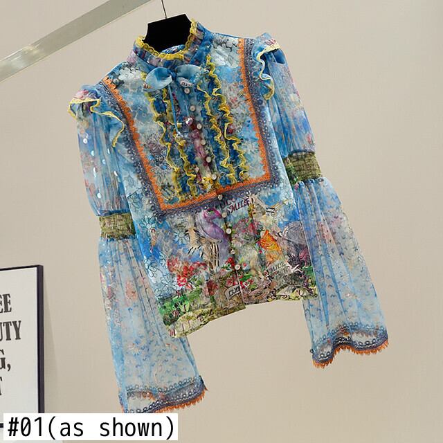[EWQ] レースフリルパッチワークブラウスプリントスタンドカラーランタンスリーブシャツパールボタントップス ラッフル 真珠