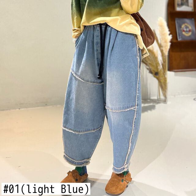 [EWQ] レディース不規則ラインパッチワークデニムパンツウエストレースアップビッグサイズジーンズ夏潮ワイドレッグパンツ サマー 夏物 ワイドパンツ
