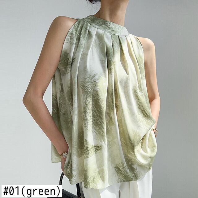 [EWQ] O ネックプリーツプリントシャツルーズカジュアルノースリーブコントラストカラー O ネック夏潮シフォントップ 438 サマー 夏物 Oネック