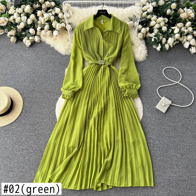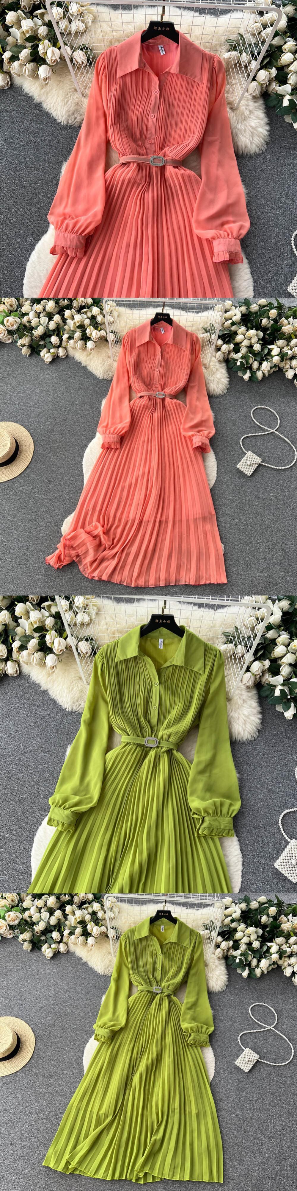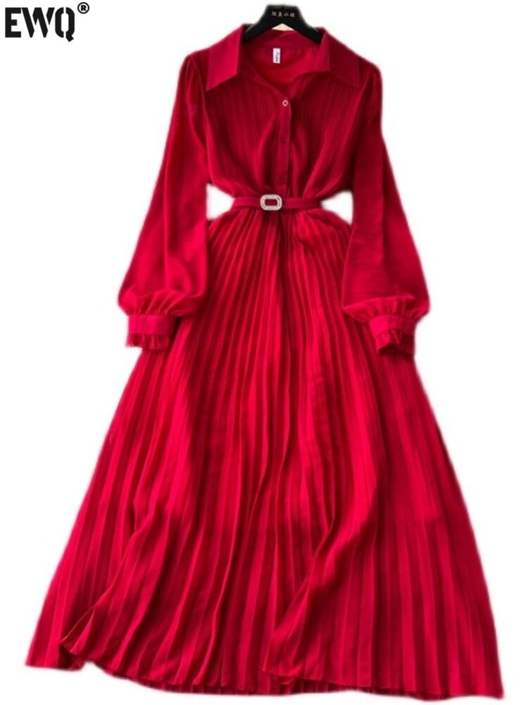 [EWQ] レッドドレスランタンスリーブラペルプリーツレースアップホリデードレス夏潮気質ローブ サマー 夏物