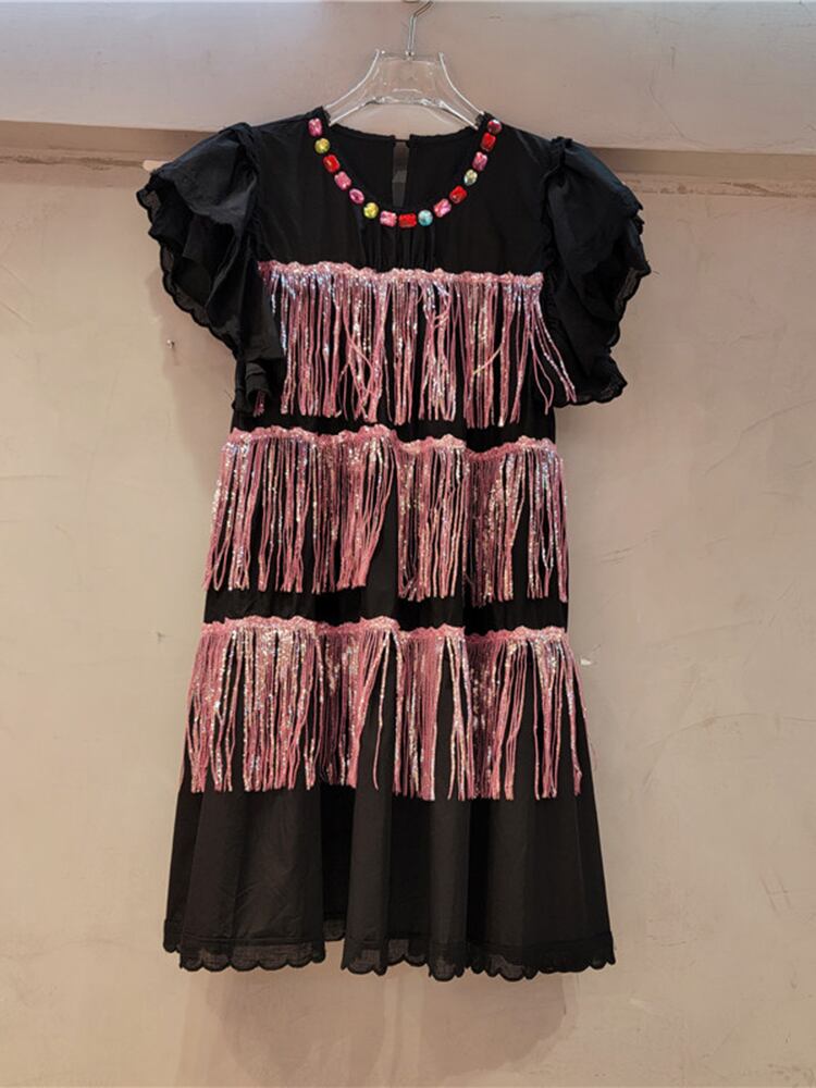 [EWQ] ダイヤモンドスパンコールテルドレスフライングスリーブホワイトバックレースアップコントラストカラーミニドレス夏 サマー 夏物