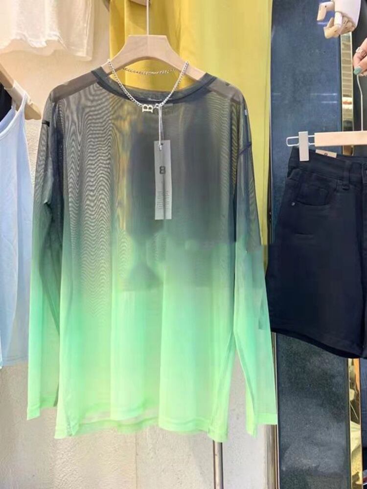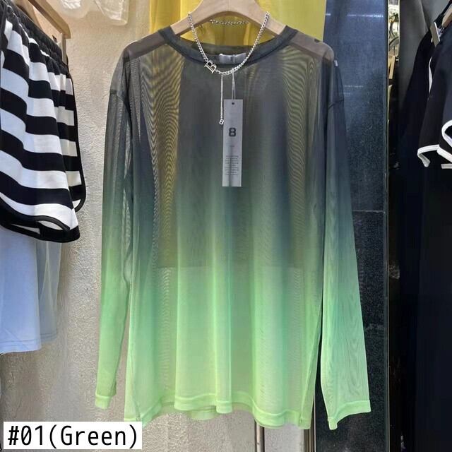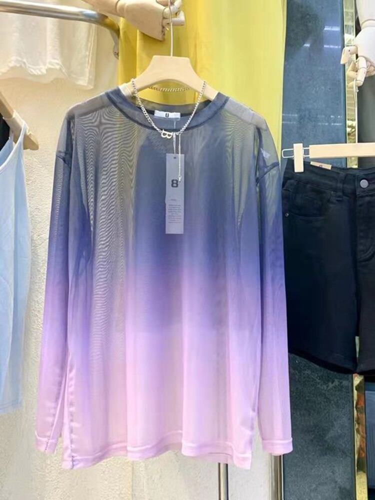 [EWQ] ビッグサイズグラデーションコントラストカラー薄手 Tシャツ夏潮長袖メッシュ透視 O ネック Tシャツトップタイダイ ロング サマー 夏物 Oネック