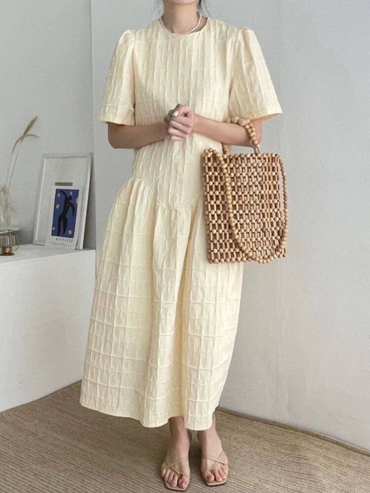 [EWQ] イエロー O ネック 3D バブルチェック柄ドレスルーズパフスリーブドレス夏潮 Vestido 172 サマー 夏物 Oネック
