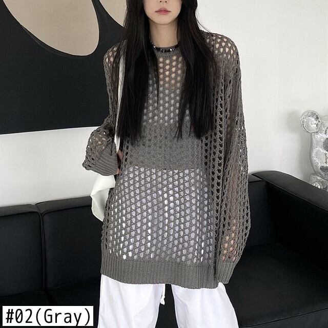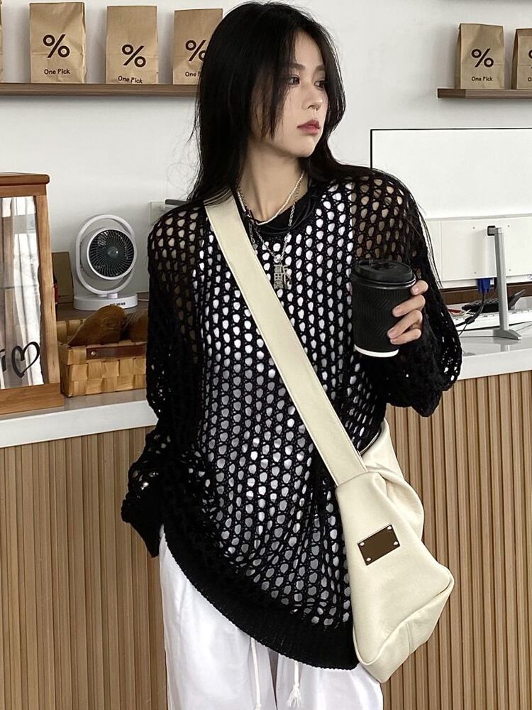 [EWQ] ストリート中空ニットトップセクシー特大長袖透視 O ネックプルオーバー薄いセーター夏 ロング サマー 夏物 Oネック