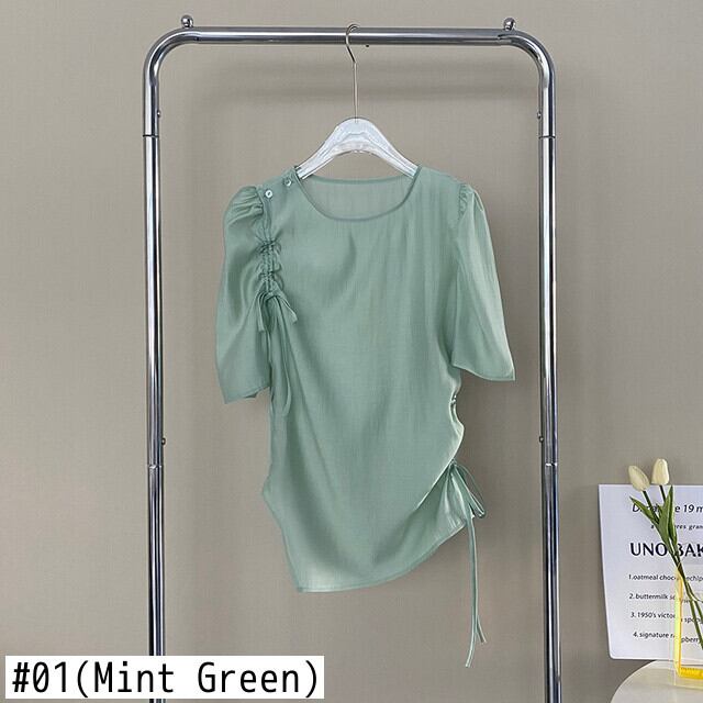 [EWQ] プリーツレースアップ非対称シャツグリーン O ネック因果視点ブラウス夏潮ボタントップ 9646 サマー 夏物 Oネック