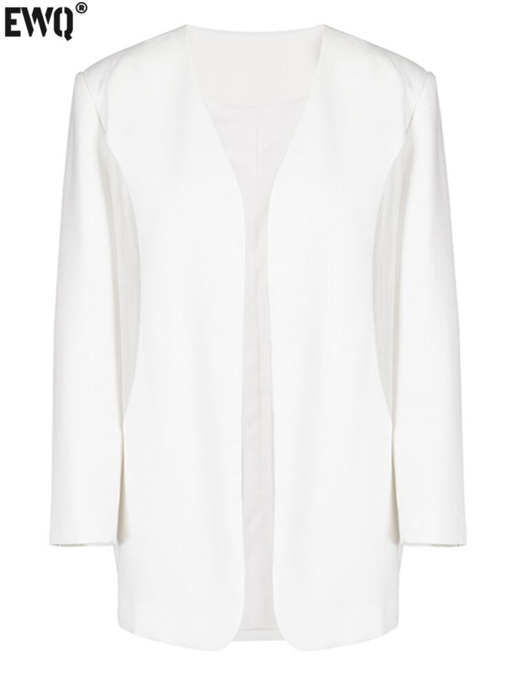 [EWQ] V ネック長袖ルーズジャケット潮秋白メッシュスプライシング美しいブレザー白トップス ロング ホワイト オータム 秋物 Vネック
