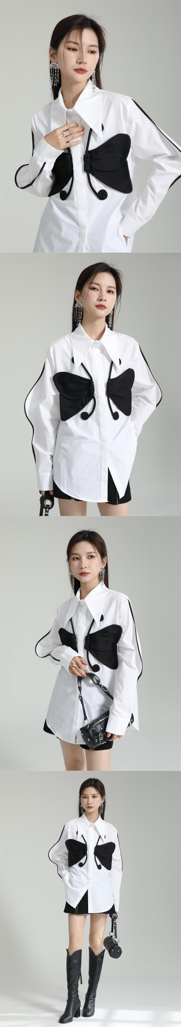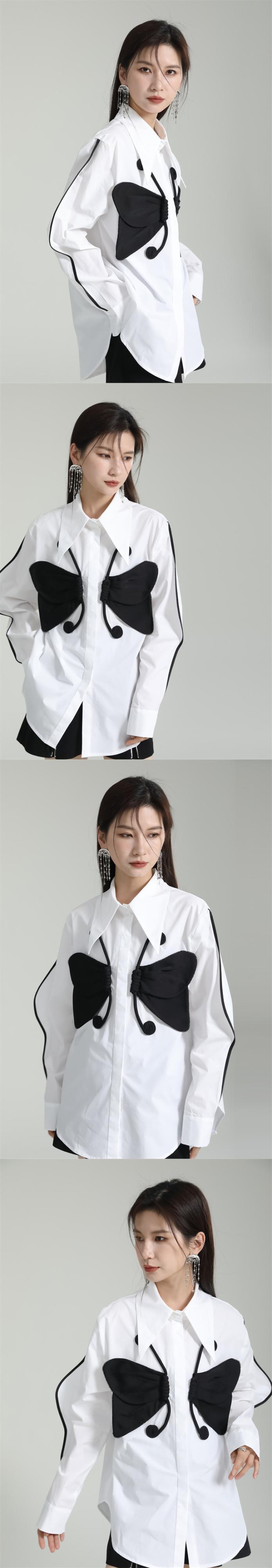 [EWQ] 3D パッチワークボウシャツ長袖コントラストカラールーズフィット夏潮トップス 16Y9715 ロング リボン サマー 夏物