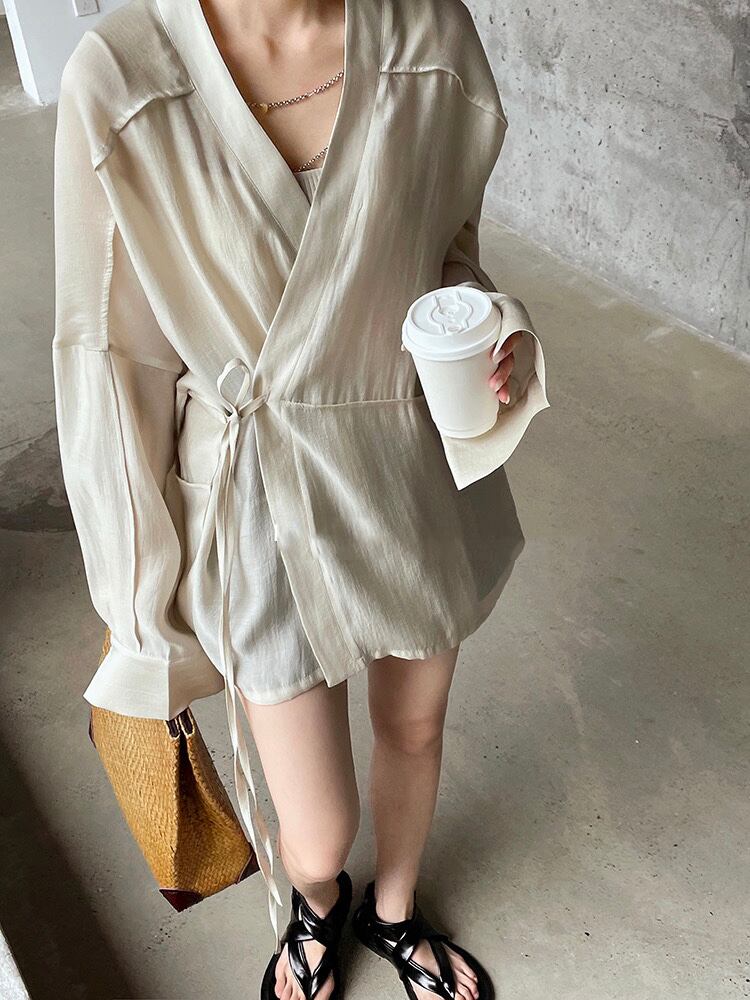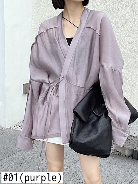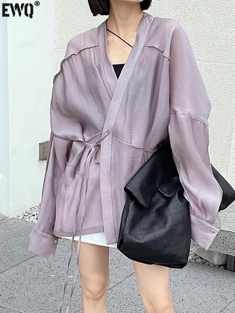 [EWQ] レディース不規則透視シャツゆったり長袖レースアップ薄手ブラウス夏潮大きいサイズY9570 ロング サマー 夏物