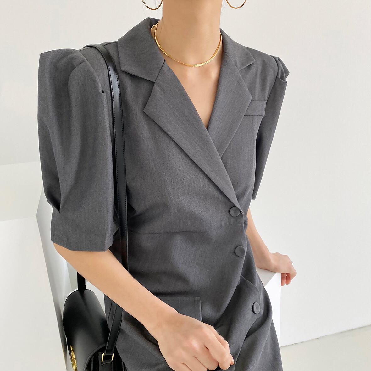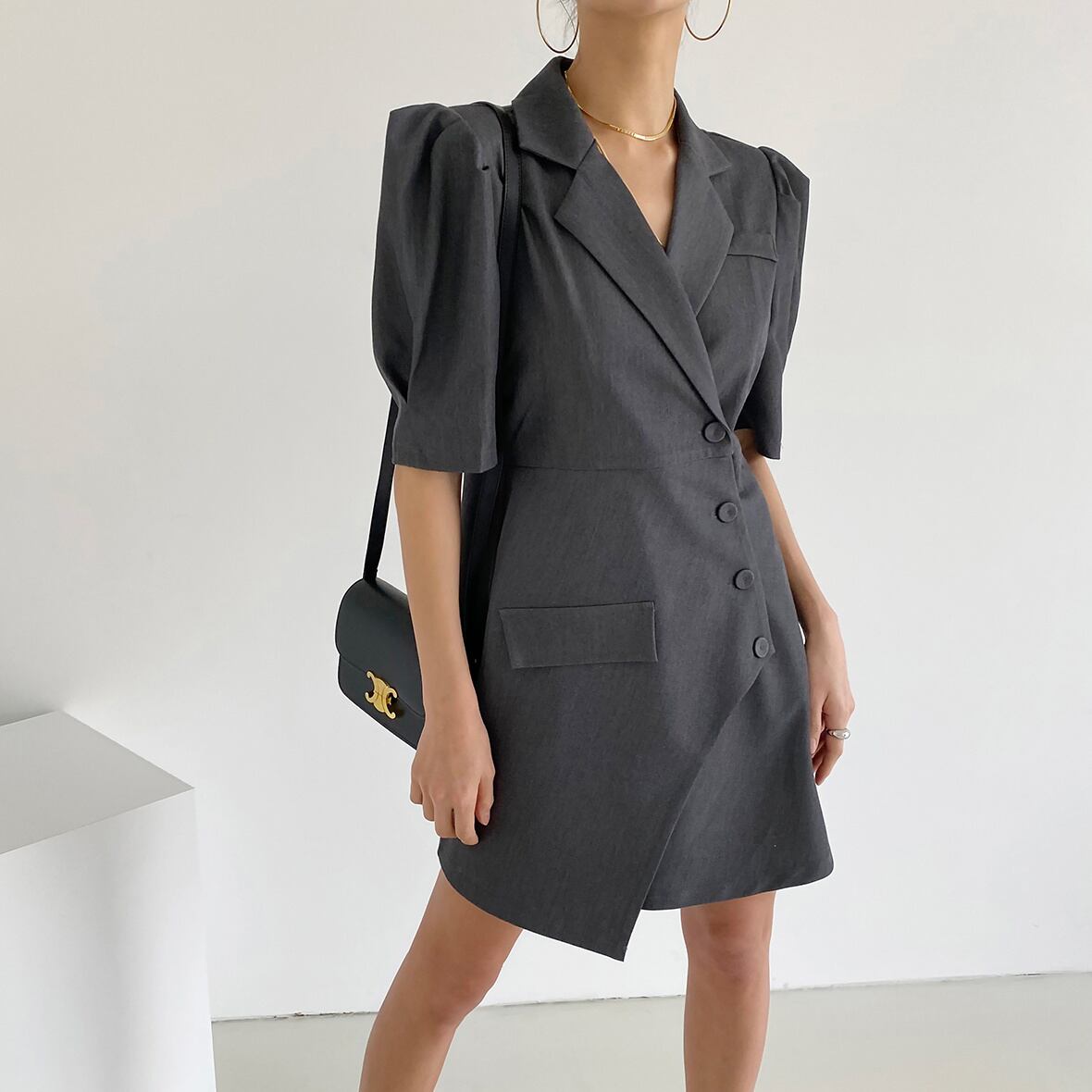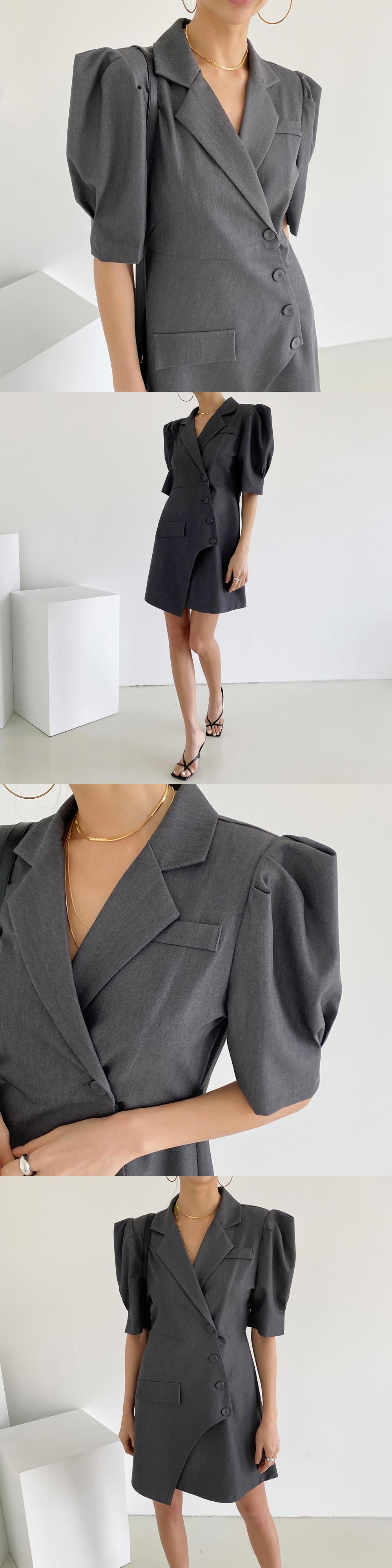[EWQ] 不規則斜めブレストスーツドレス半袖グレーミニドレス夏潮 Y9689 ショート ハーフスリーブ サマー 夏物