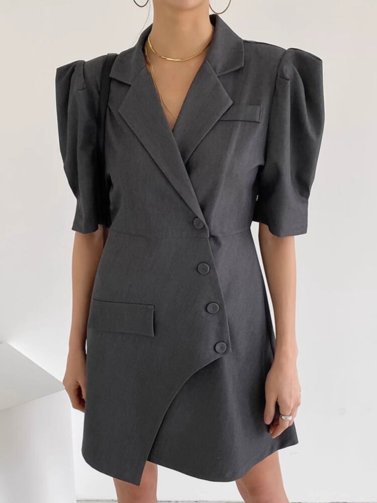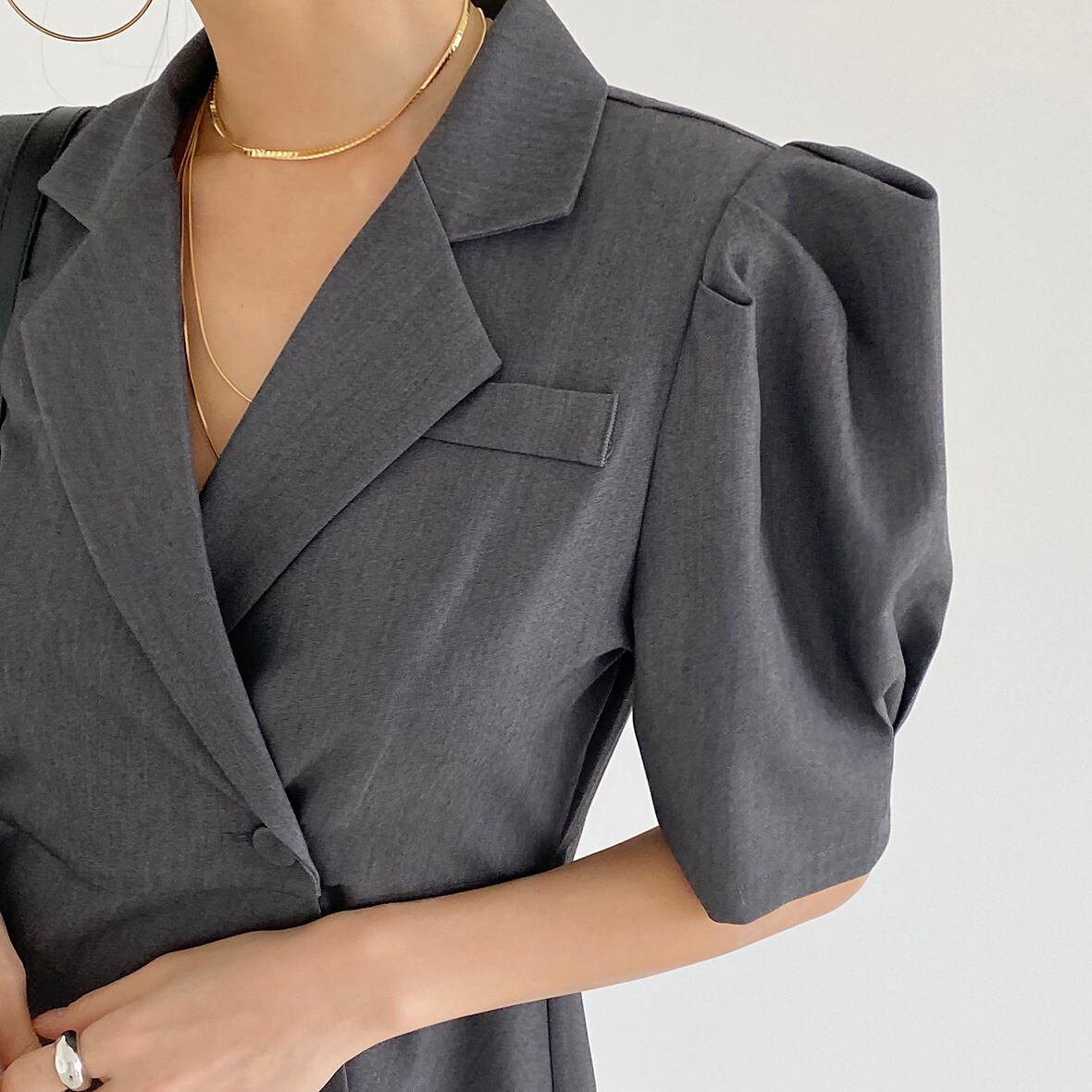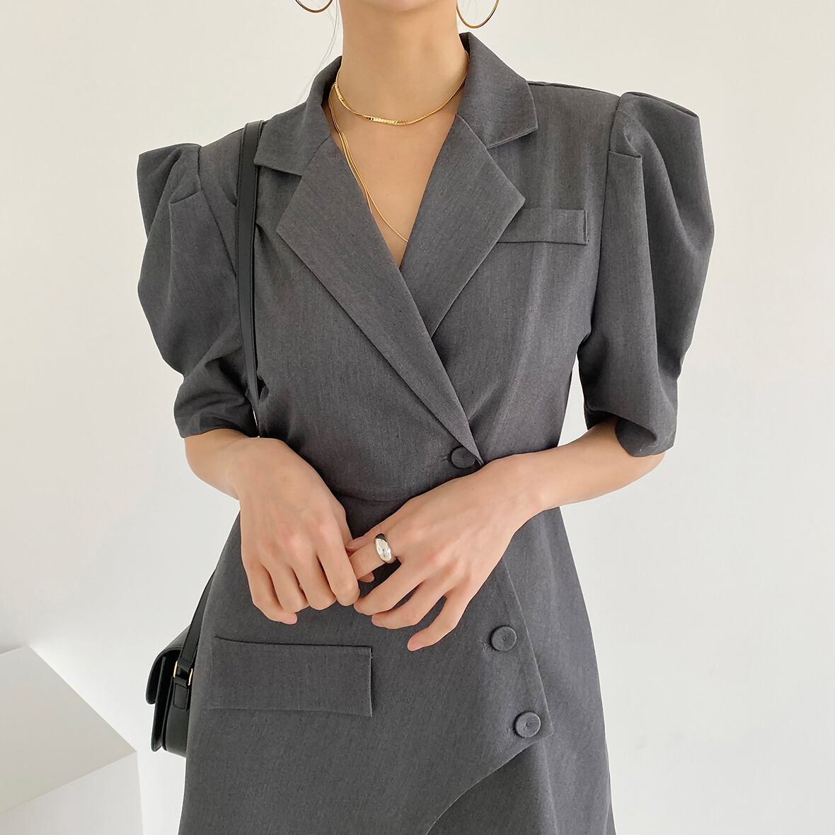 [EWQ] 不規則斜めブレストスーツドレス半袖グレーミニドレス夏潮 Y9689 ショート ハーフスリーブ サマー 夏物