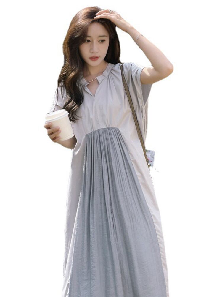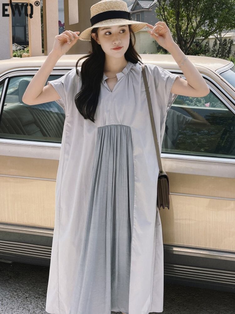 [EWQ] バック中空アウトドレスプリーツパッチワークルーズスタンドドレス夏潮気質 Vestido 16U112 サマー 夏物