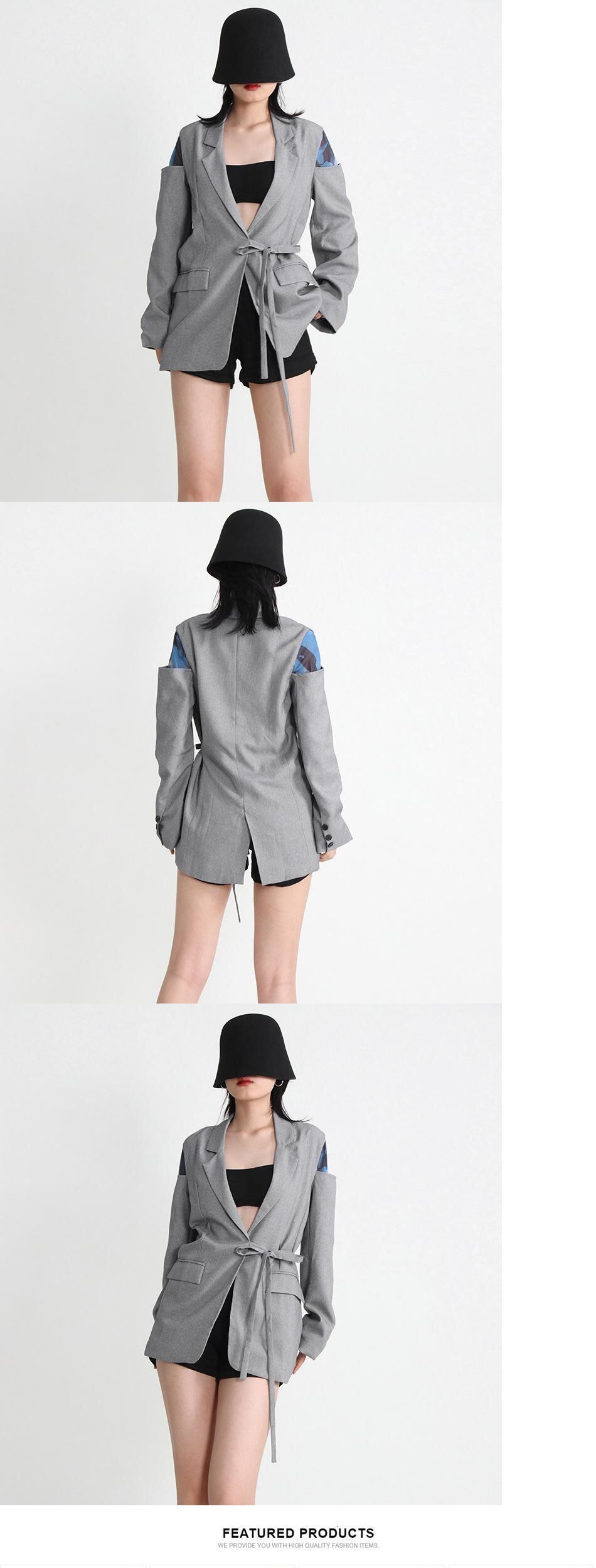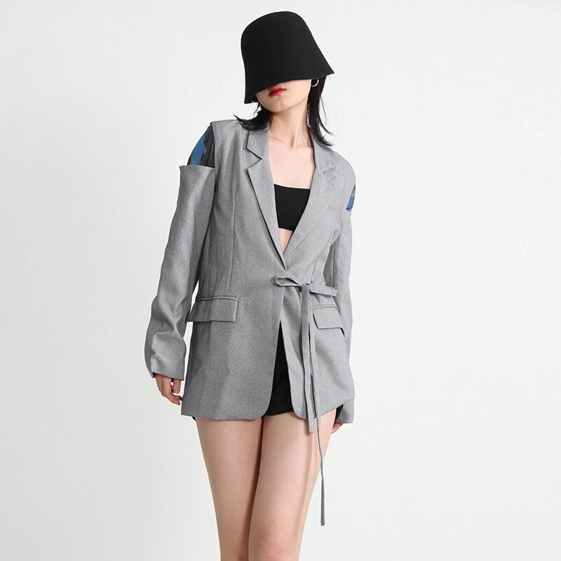 [EWQ] ストリート長袖ヒットカラー秋ブレザーノッチ襟パッチワークレースアップルーズコート服 R30 ロング オータム 秋物