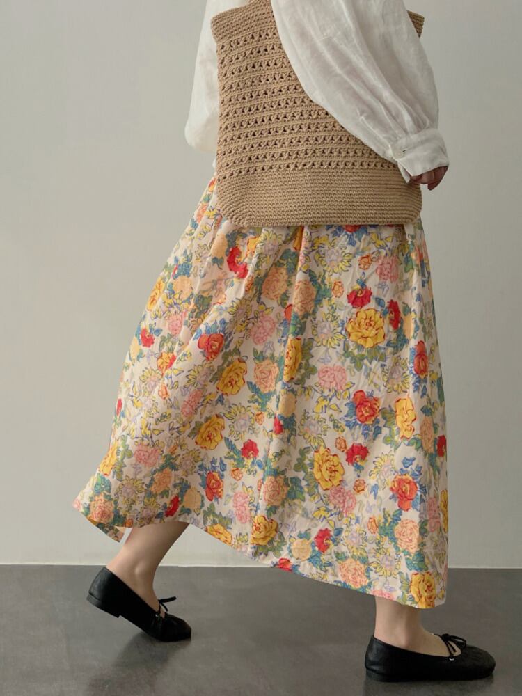 [EWQ] フラワープリントコントラストシフォンスカートレディースウエスト弾性気質ミッドカーフスカート夏潮 エラスティック 伸縮 サマー 夏物 フラワーデザイン