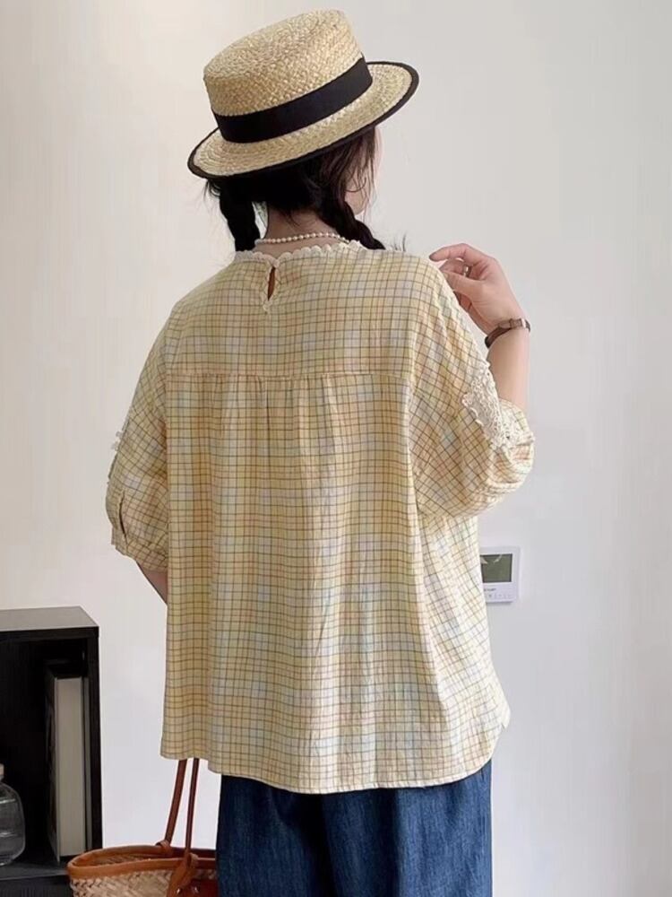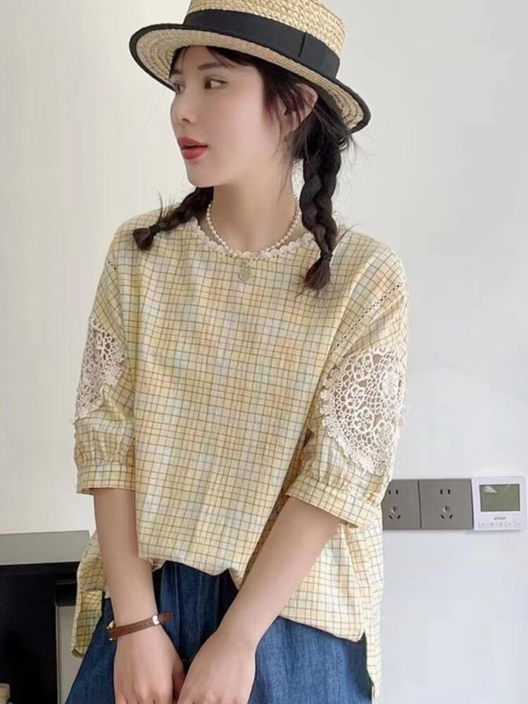 [EWQ] Sweet レディース シャツ チェック フック フラワー コントラスト 半袖 O ネック ルーズ 夏 潮 トップ 16U79 ショート レッド ハーフスリーブ 大人ガーリー スウィート キュート カジュアル サマー 夏物 Oネック フラワーデザイン