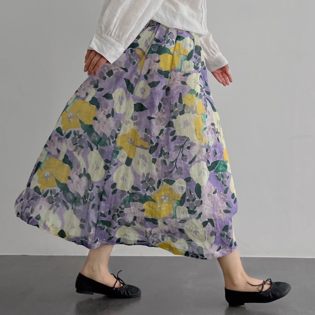 [EWQ] パープルタイダイフラワースカートウエスト弾性コントラストカラー A ラインスカート夏潮服 エラスティック 伸縮 サマー 夏物 Aライン フラワーデザイン