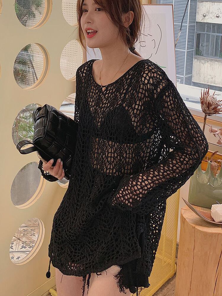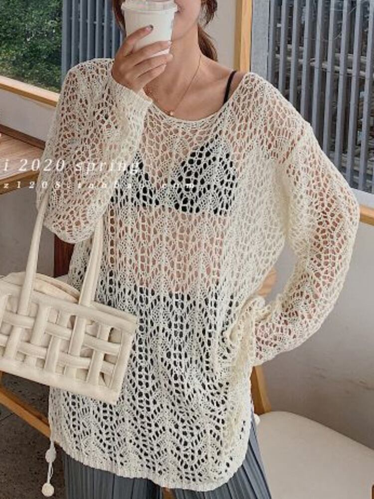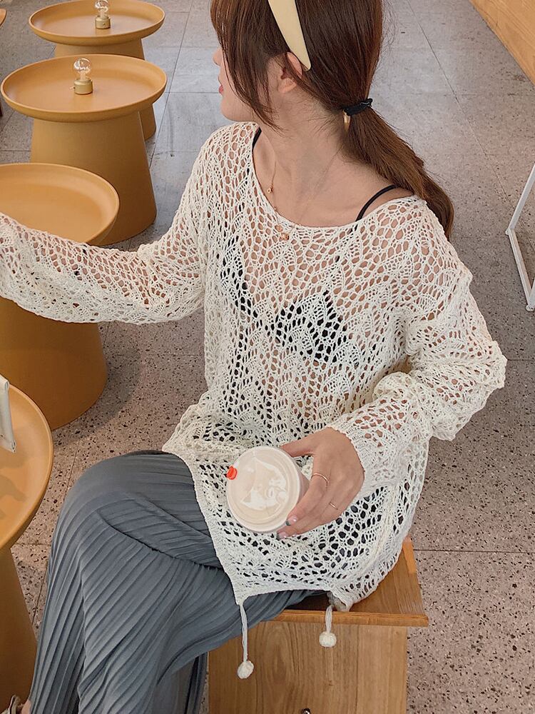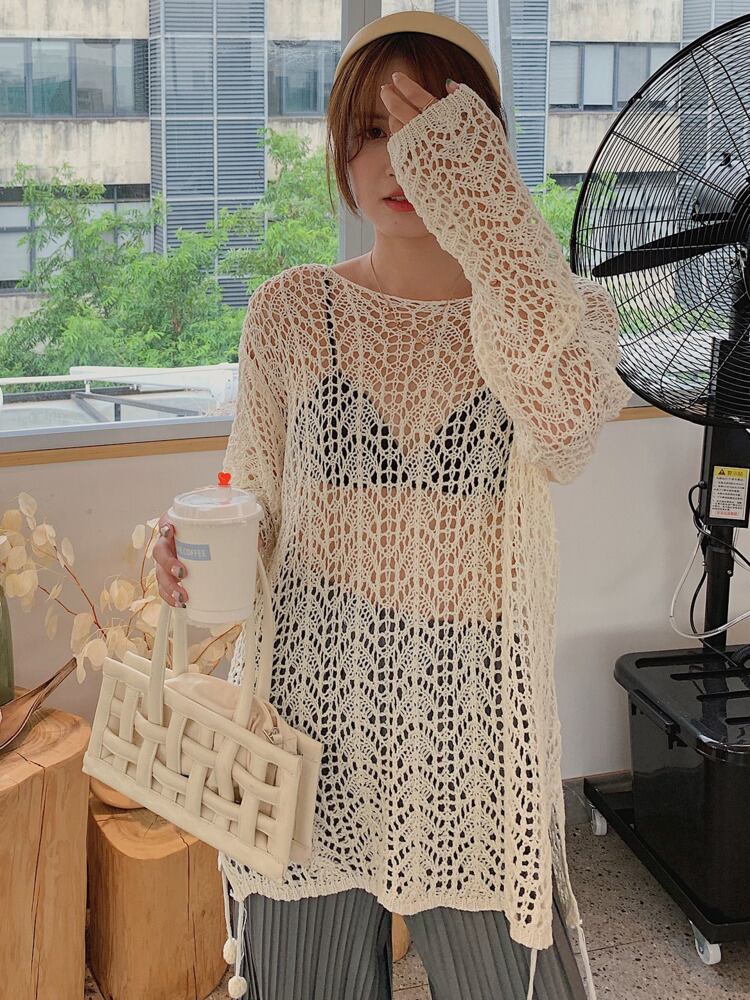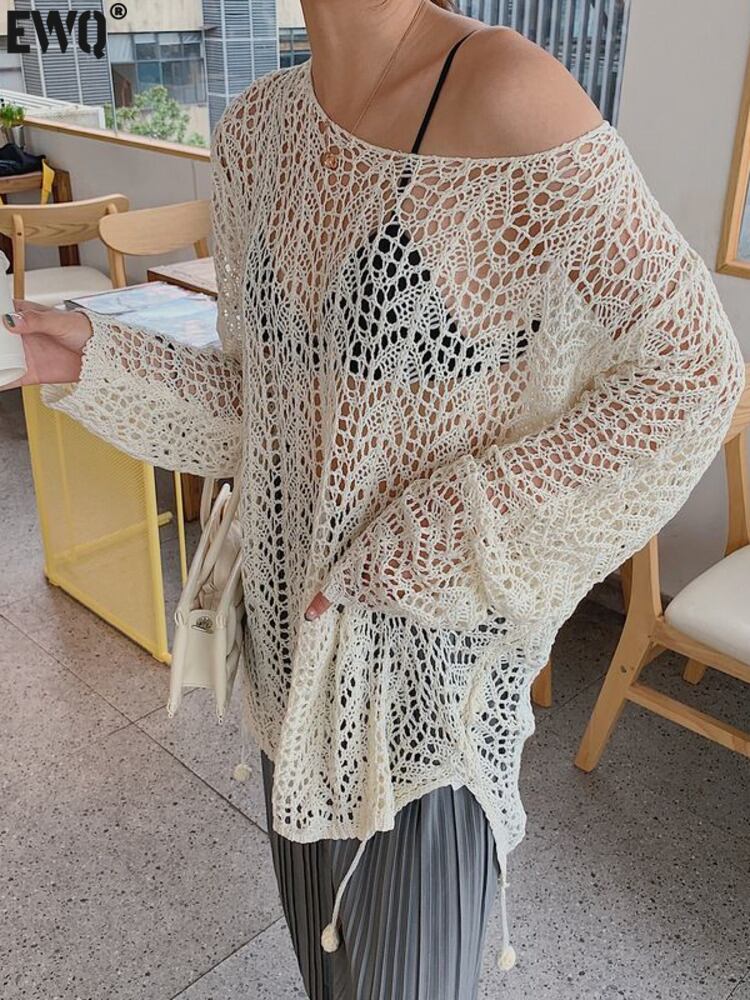 [EWQ] セクシー中空アウトニットトップ長袖夏潮ルーズ特大 O ネック薄い視点プルオーバートップス 9424 ロング サマー 夏物 Oネック