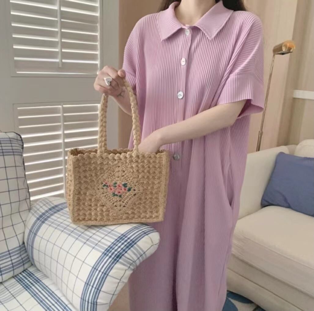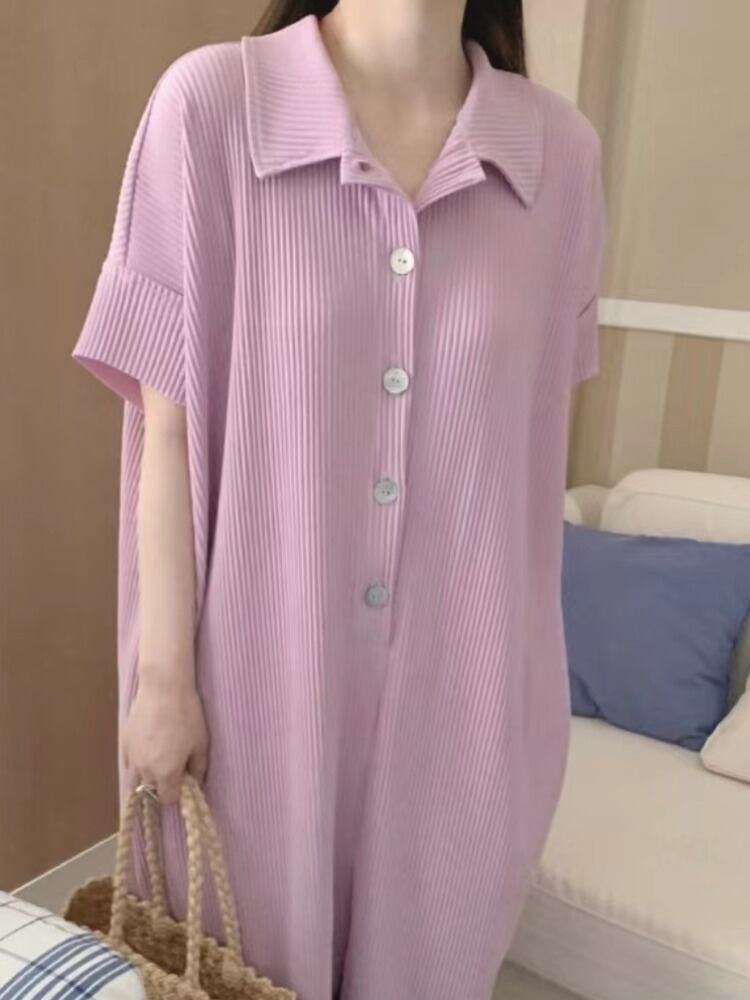 [EWQ] パープル T シャツドレスルース因果ボタン装飾半袖ドレス夏潮 Vestidos ショート ハーフスリーブ サマー 夏物 Tシャツ
