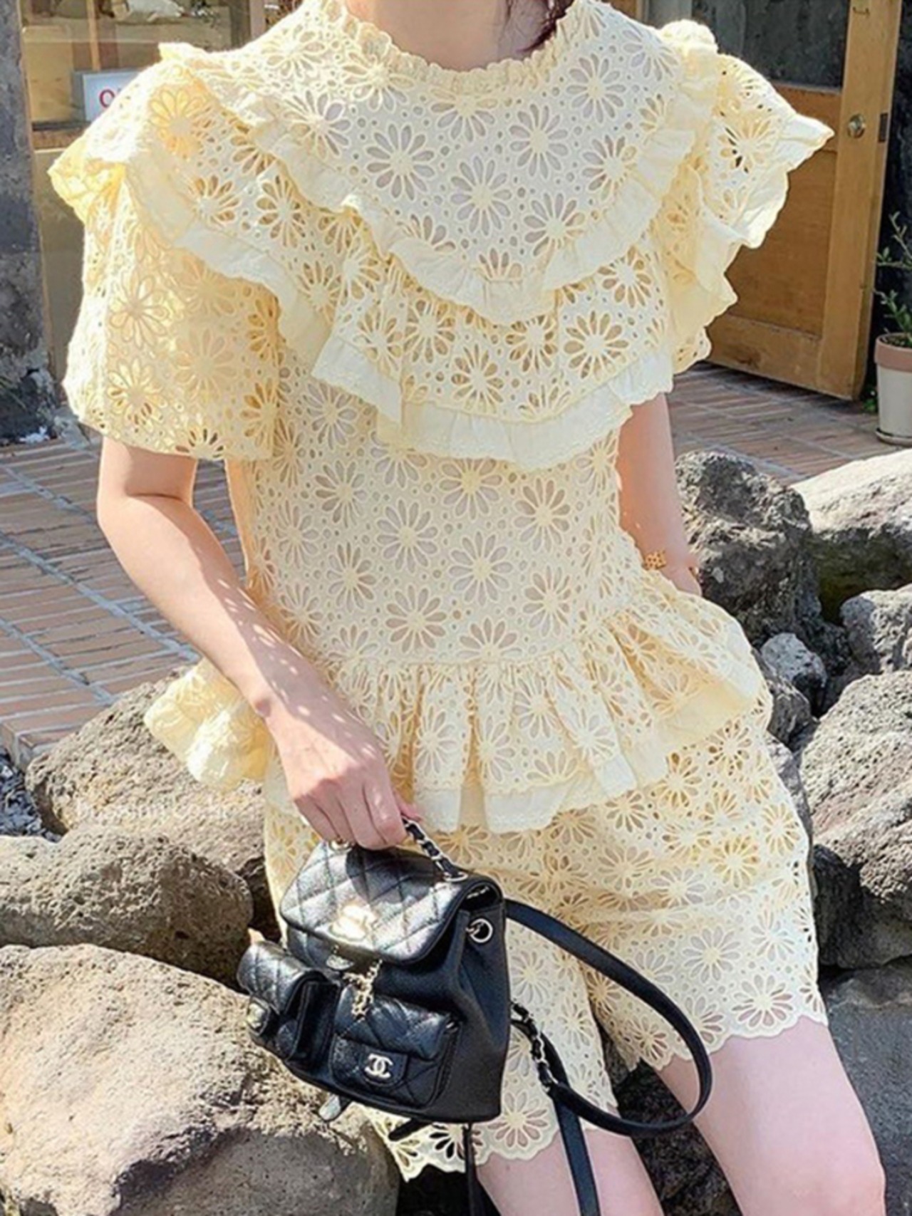 [EWQ] ツーピーススーツ中空アウトフックフラワーフリルシャツ + ハイウエストショーツセット夏潮 Y9518 ハイウェスト サマー 夏物 ブルマー フラワーデザイン