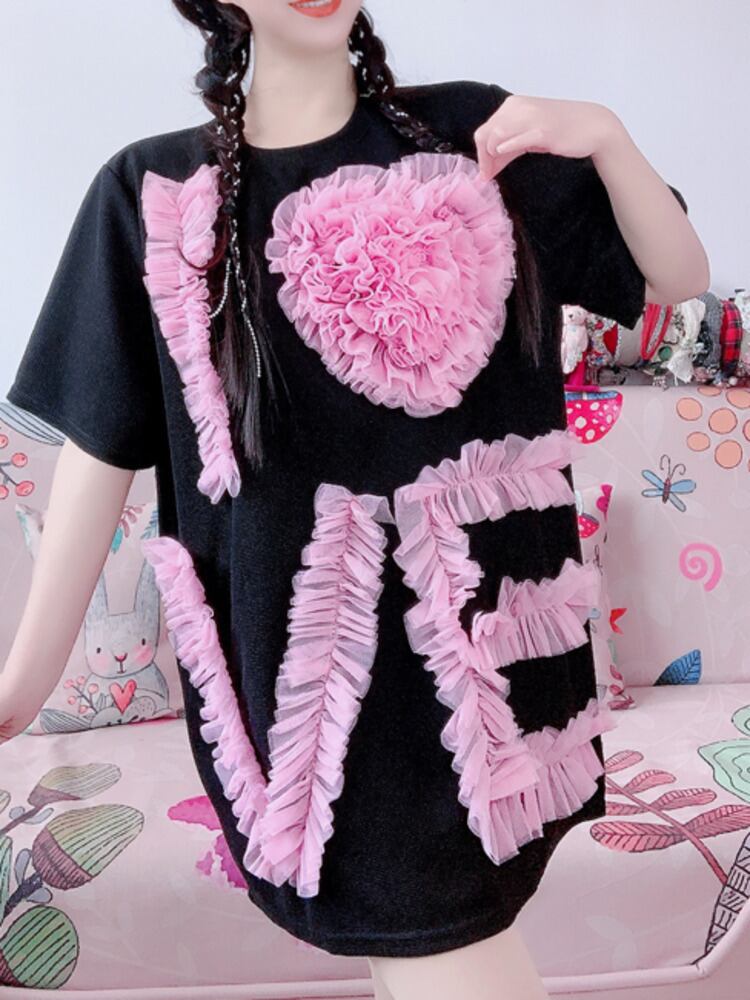 [EWQ] 3D メッシュスプライスフラワーハート T シャツドレスコントラストカラー半袖ルーズミニドレス夏 ショート ハーフスリーブ サマー 夏物 Tシャツ フラワーデザイン