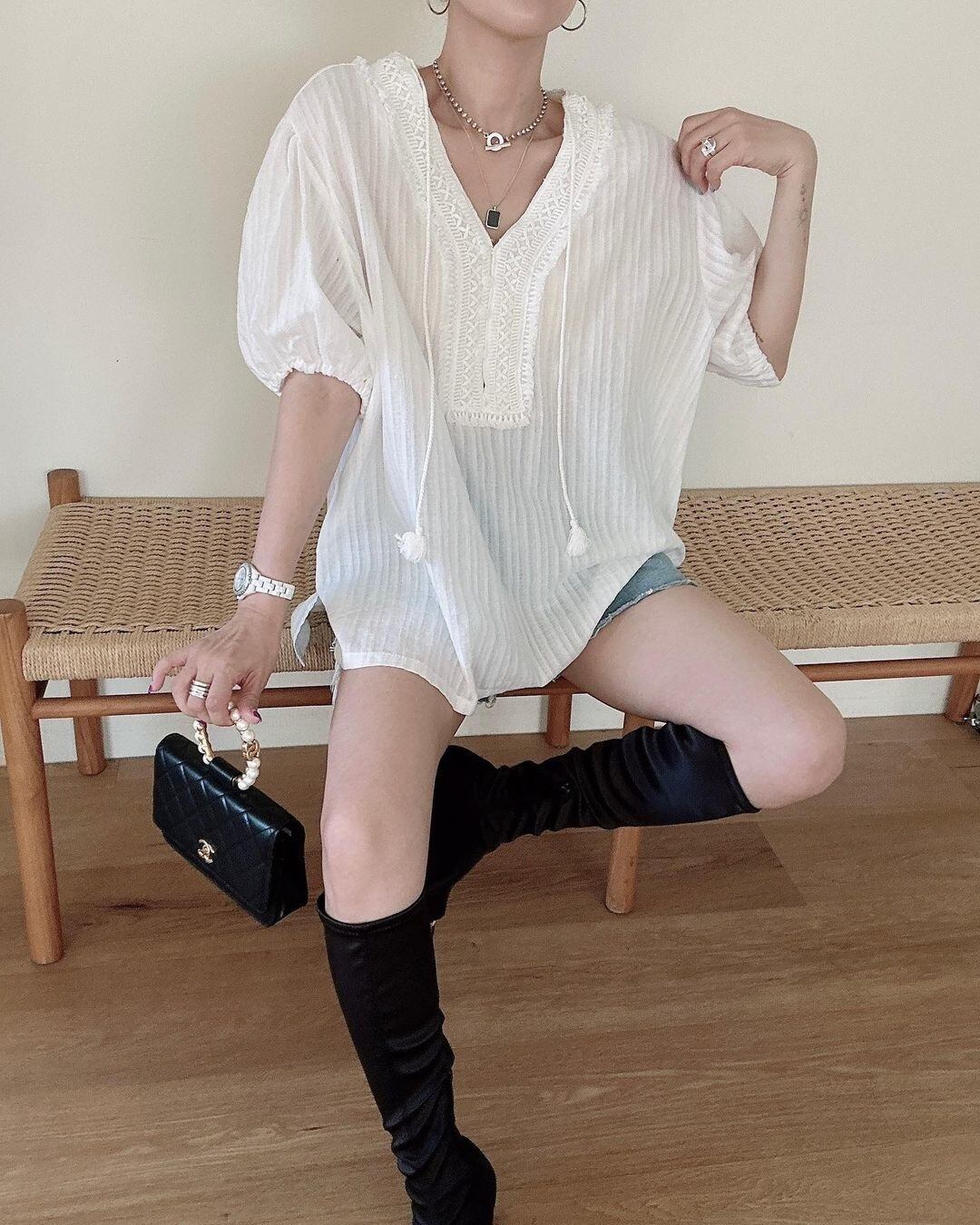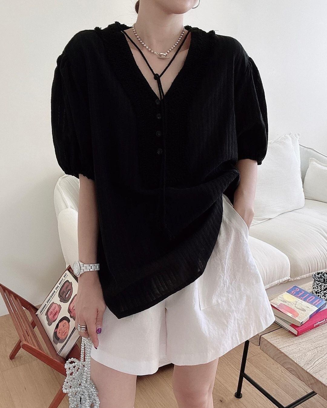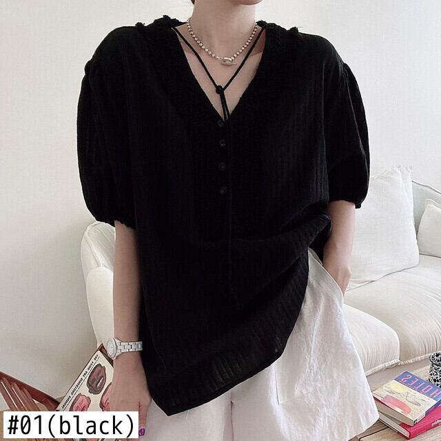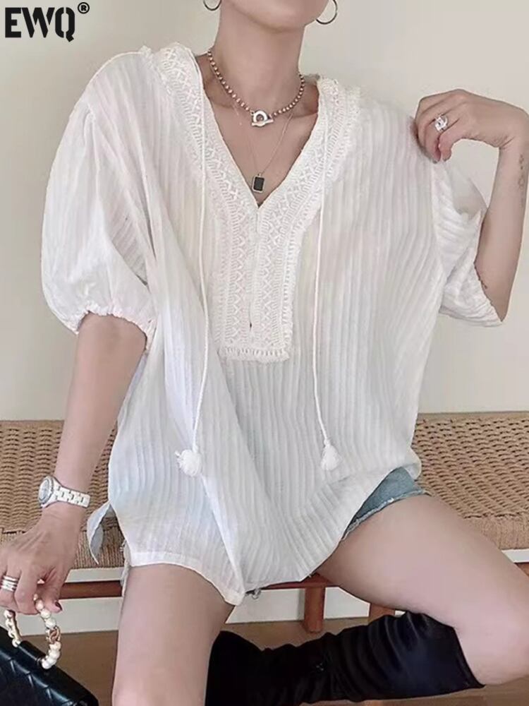 [EWQ] フックフラワーレース V ネックシャツ白パフスリーブルーズカジュアルレースアップトップ夏潮 16Y9738 ホワイト サマー 夏物 Vネック フラワーデザイン