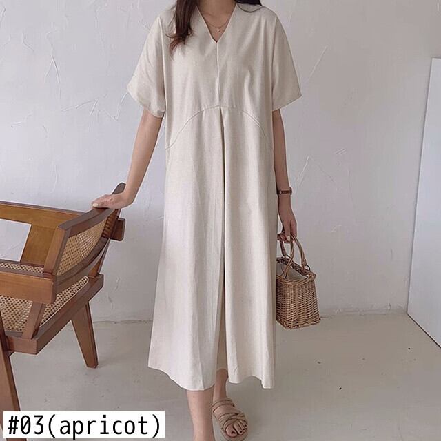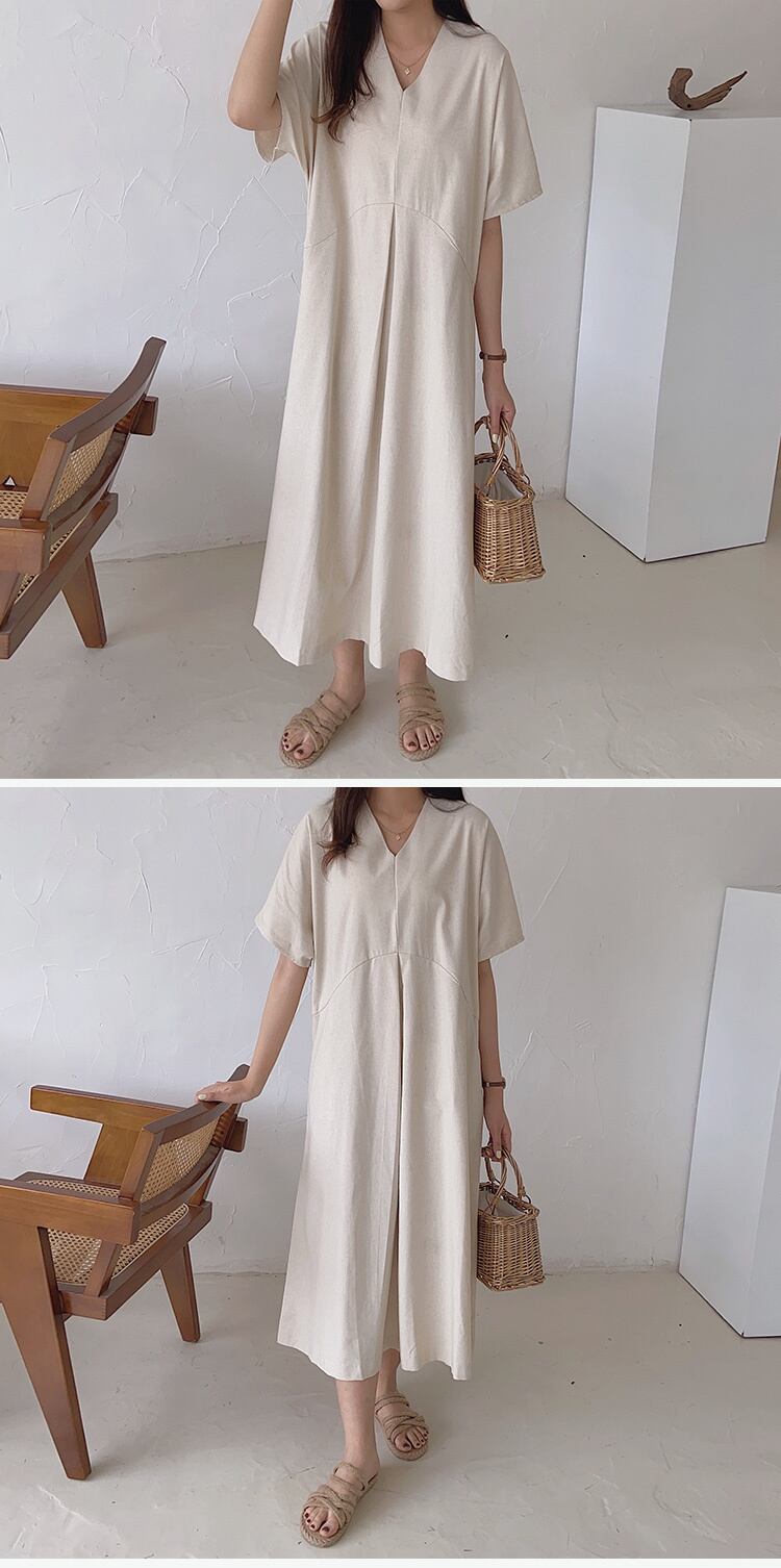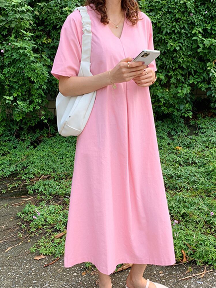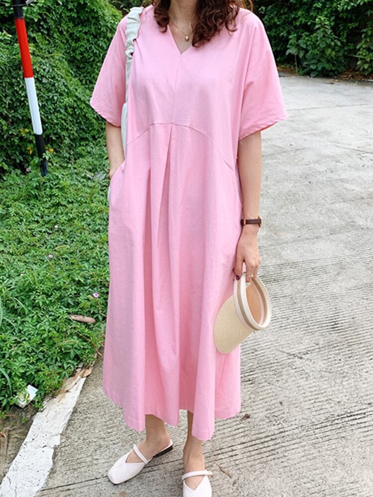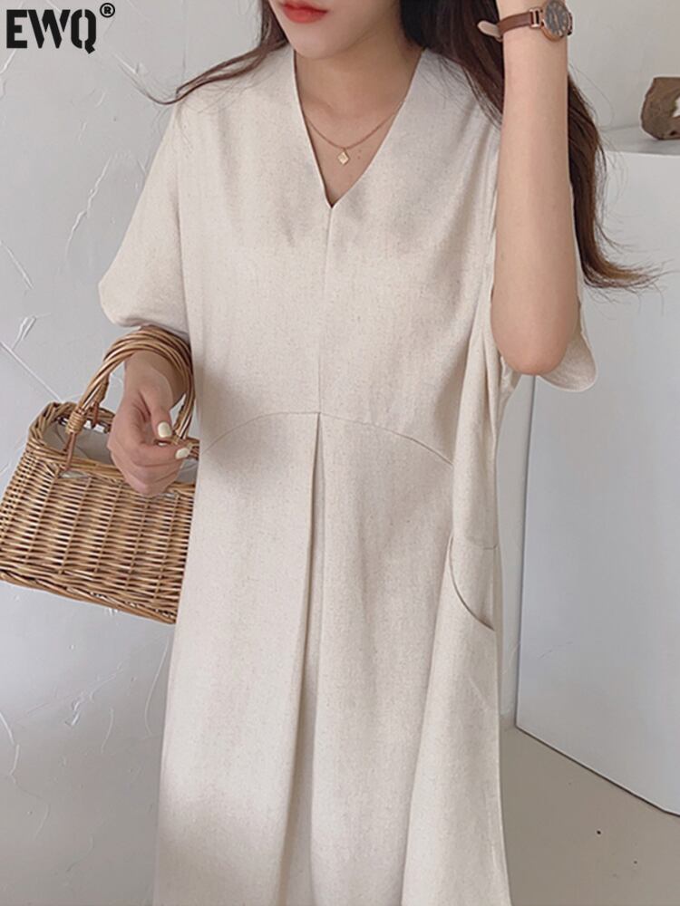 [EWQ] V ネックルーズソリッドポケットドレスシンプル半袖マキシドレス夏潮 Vestido 16Y8000 ショート ハーフスリーブ サマー 夏物 Vネック ソリッドカラー