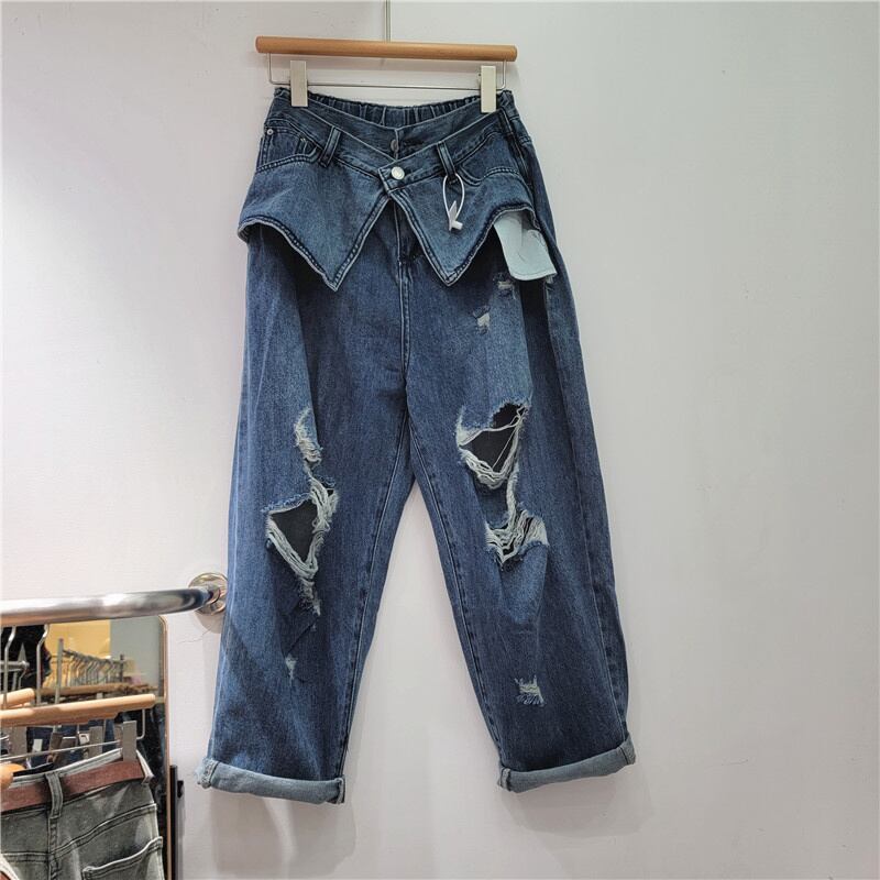 [EWQ] 偽ツーピースパッチワークデニムパンツ穴ウエストストリートポケットジーンズ夏ズボン 6Y9568 サマー 夏物
