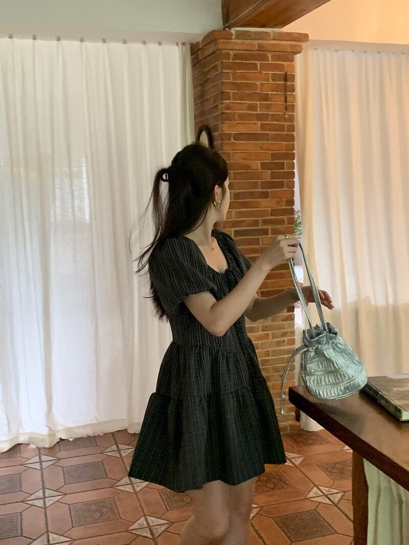 [EWQ] ストライプコントラストレースアップショートドレスバブルスリーブプリーツパッチワーク O ネックミニドレス夏 Vestido サマー 夏物 Oネック