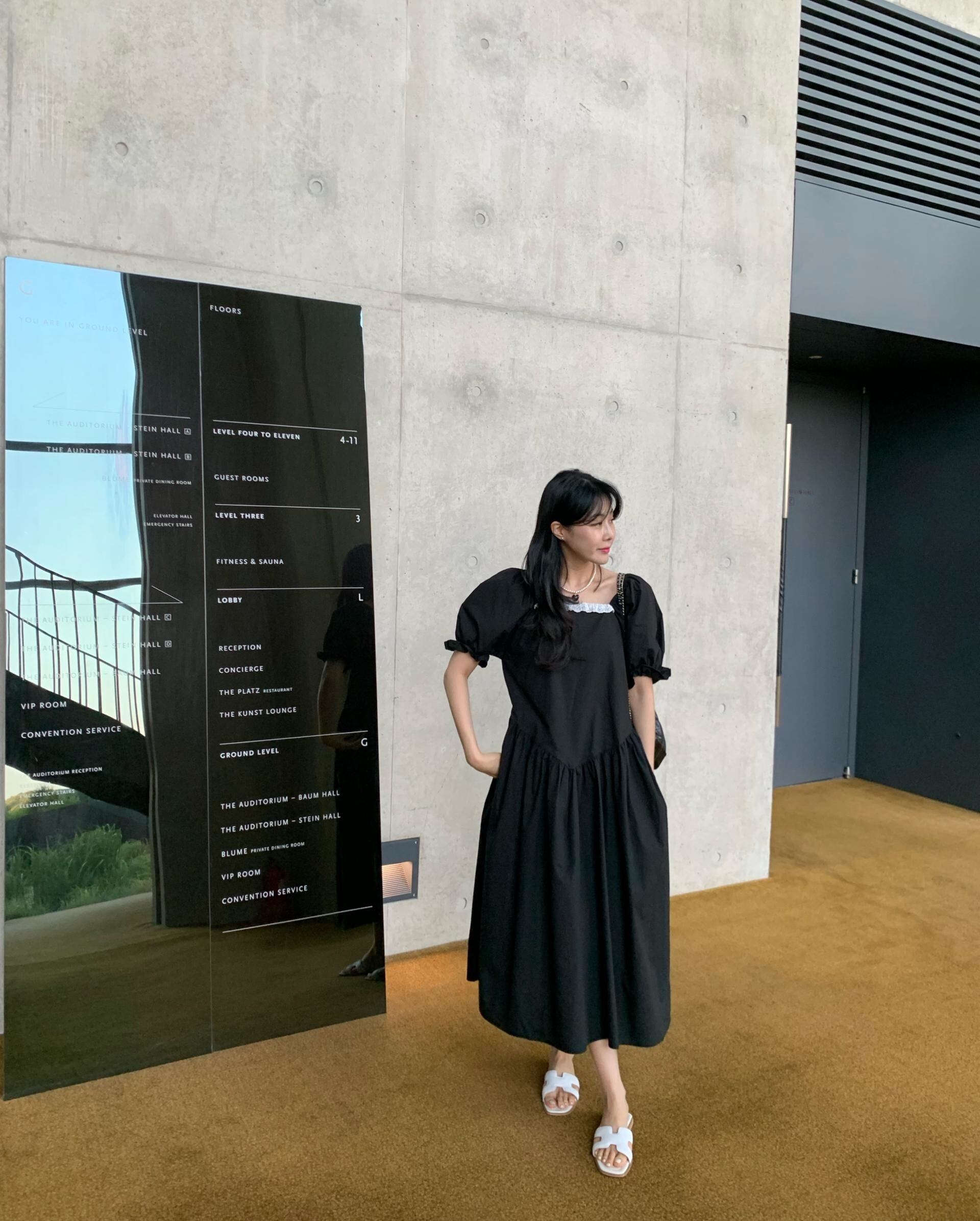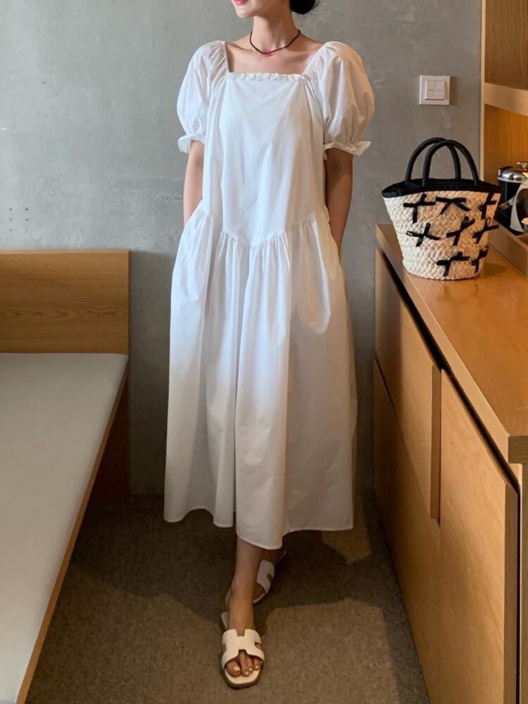 [EWQ] スクエアネックレースパッチワークドレスプリーツスプライシングブラックパフスリーブドレス夏潮 Vestido 9707 サマー 夏物 スクウェア