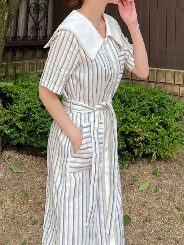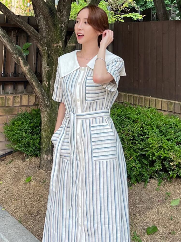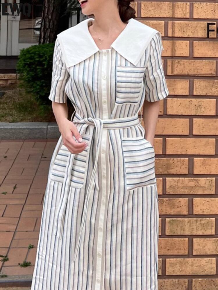[EWQ] コントラストストライプシャツドレスシングルブレストポケットパッチワークレースアップドレス夏潮 Vestido サマー 夏物