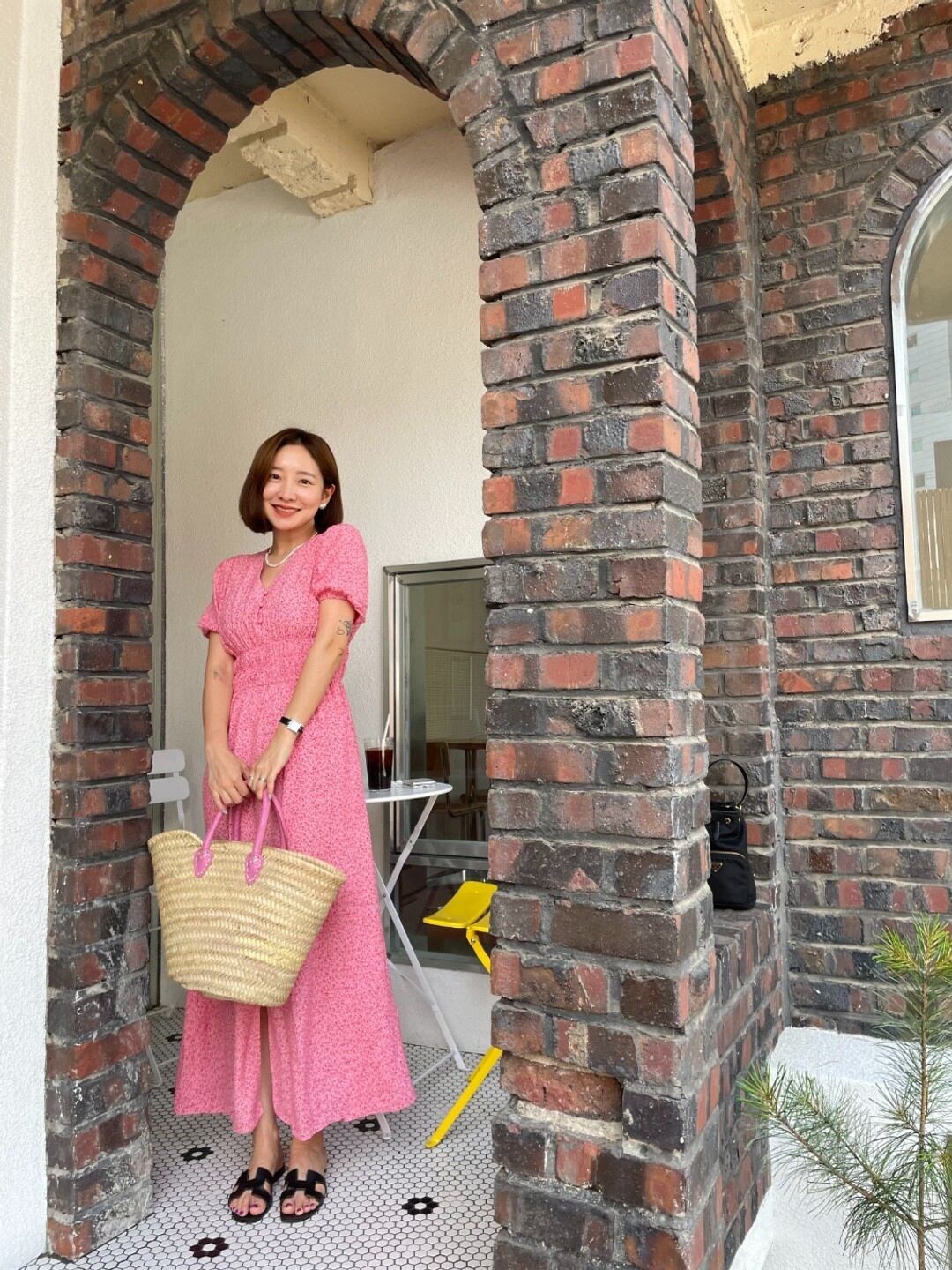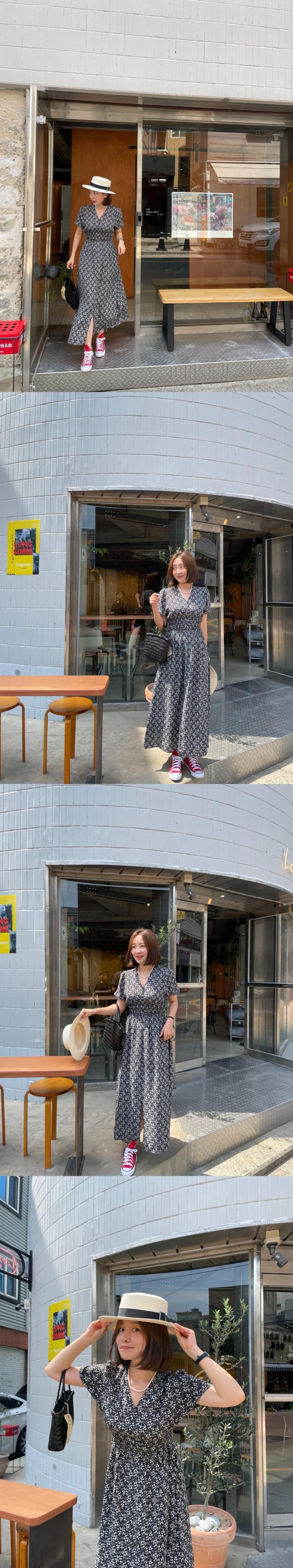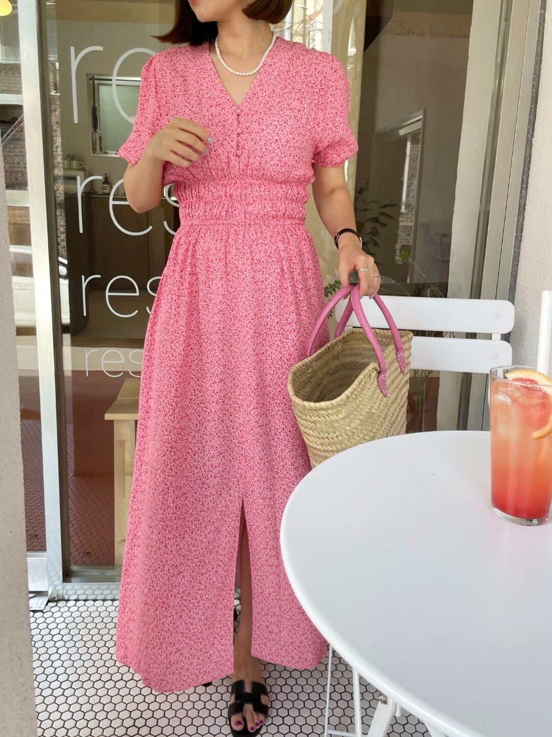 [EWQ] コントラストカラーフラワードレス V ネックバブルスリーブスプリットドレス夏潮気質 Vestido 9704 サマー 夏物 Vネック フラワーデザイン