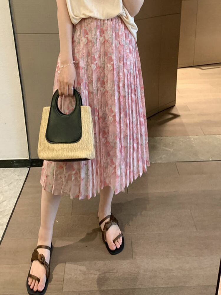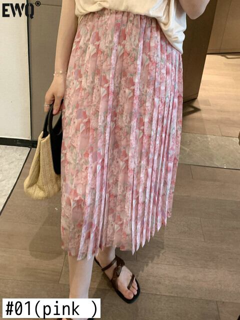 [EWQ] 甘いピンクスカートプリーツフラワーコントラストウエスト A ラインスカート夏潮オールマッチ服 343 大人ガーリー スウィート キュート カジュアル サマー 夏物 Aライン フラワーデザイン